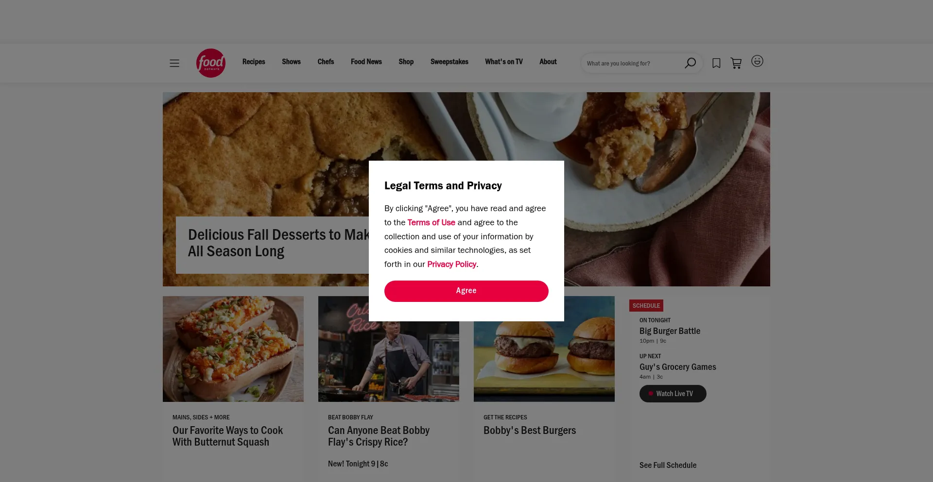 Die Website implementiert Cookie-Zustimmungsmechanismen in Compliance mit Datenschutzregulierungen wie DSGVO oder CCPA. Dies demonstriert, dass foodnetwork.com Datenschutzstandards einhält und Benutzern Kontrolle über persönliche Datenerfassungspraktiken bietet.
