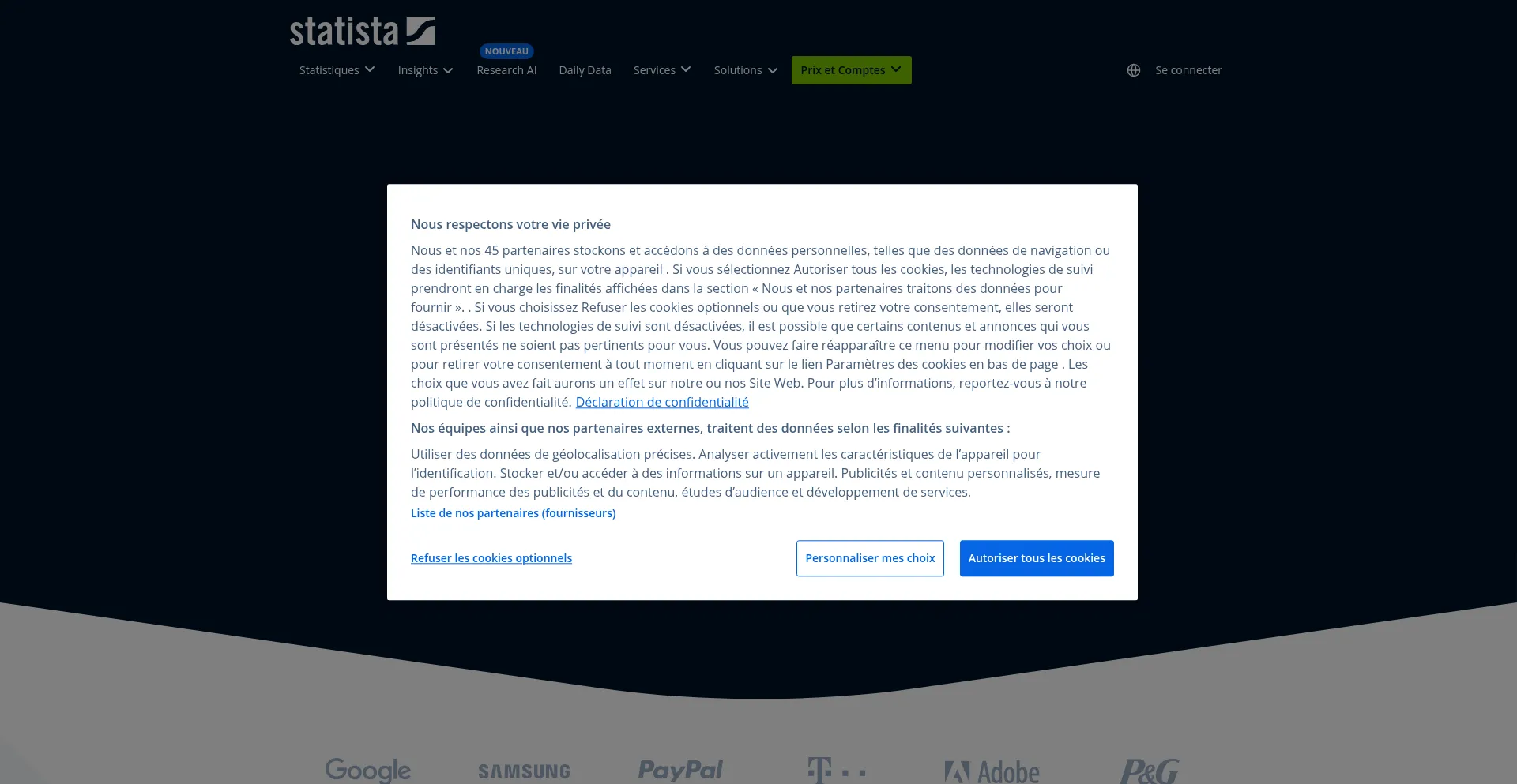Die Website implementiert Cookie-Zustimmungsmechanismen in Compliance mit Datenschutzregulierungen wie DSGVO oder CCPA. Dies demonstriert, dass fr.statista.com Datenschutzstandards einhält und Benutzern Kontrolle über persönliche Datenerfassungspraktiken bietet.
