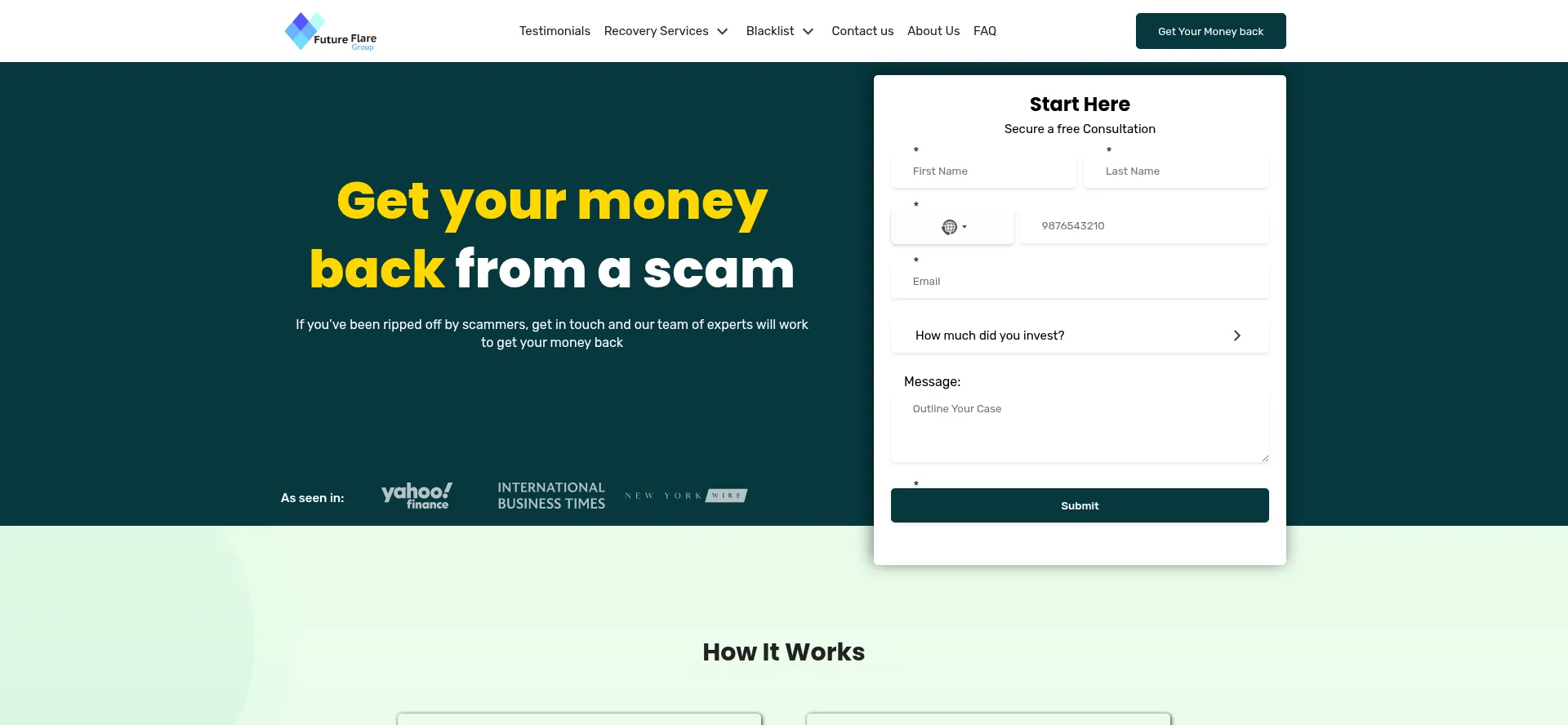 Die Website futureflaregroup.com bewirbt Fondswiederherstellungsdienste für verlorene oder gestohlene Vermögenswerte. Während einige auf Erfolgshonorarbasis operieren, können andere Vorauszahlungen erfordern, was auf betrügerische Operationen hinweisen kann. Verifizieren Sie Anmeldeinformationen und regulatorische Compliance, bevor Sie solche Dienste in Anspruch nehmen.