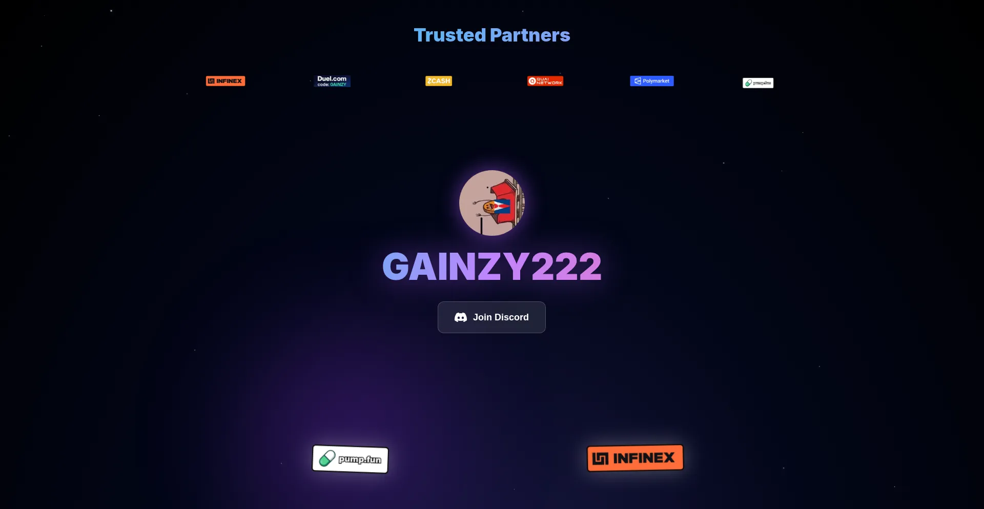 polymarket.com www.gainzy.fun dexscreener.com qu.ai duel.com pump.fun discord.gg app.infinex.xyz gainzy.fun z.cash