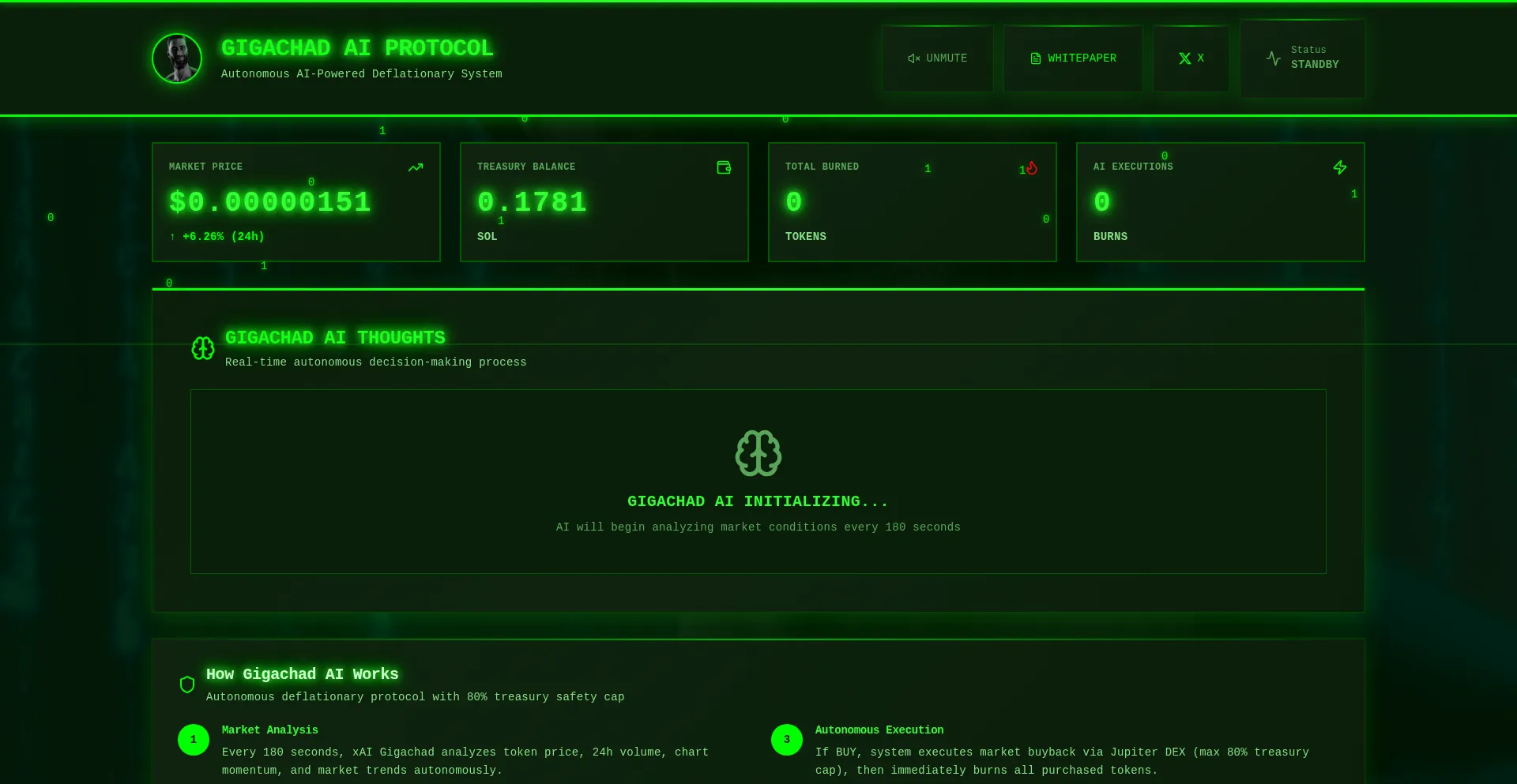 Gigachad AI Protocol - Autonomous AI-powered buyback and burn system. Gigachad AI analyzes market conditions every 3 minutes and executes strategic token burns on Solana.