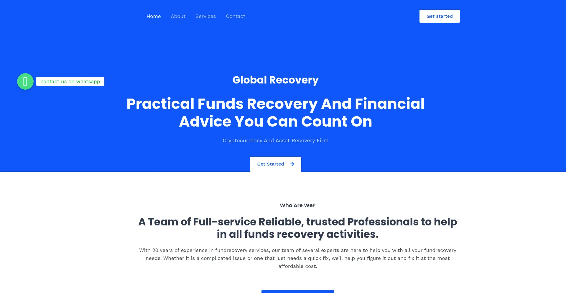 Die Website globalrecov.com bewirbt Fondswiederherstellungsdienste für verlorene oder gestohlene Vermögenswerte. Während einige auf Erfolgshonorarbasis operieren, können andere Vorauszahlungen erfordern, was auf betrügerische Operationen hinweisen kann. Verifizieren Sie Anmeldeinformationen und regulatorische Compliance, bevor Sie solche Dienste in Anspruch nehmen.