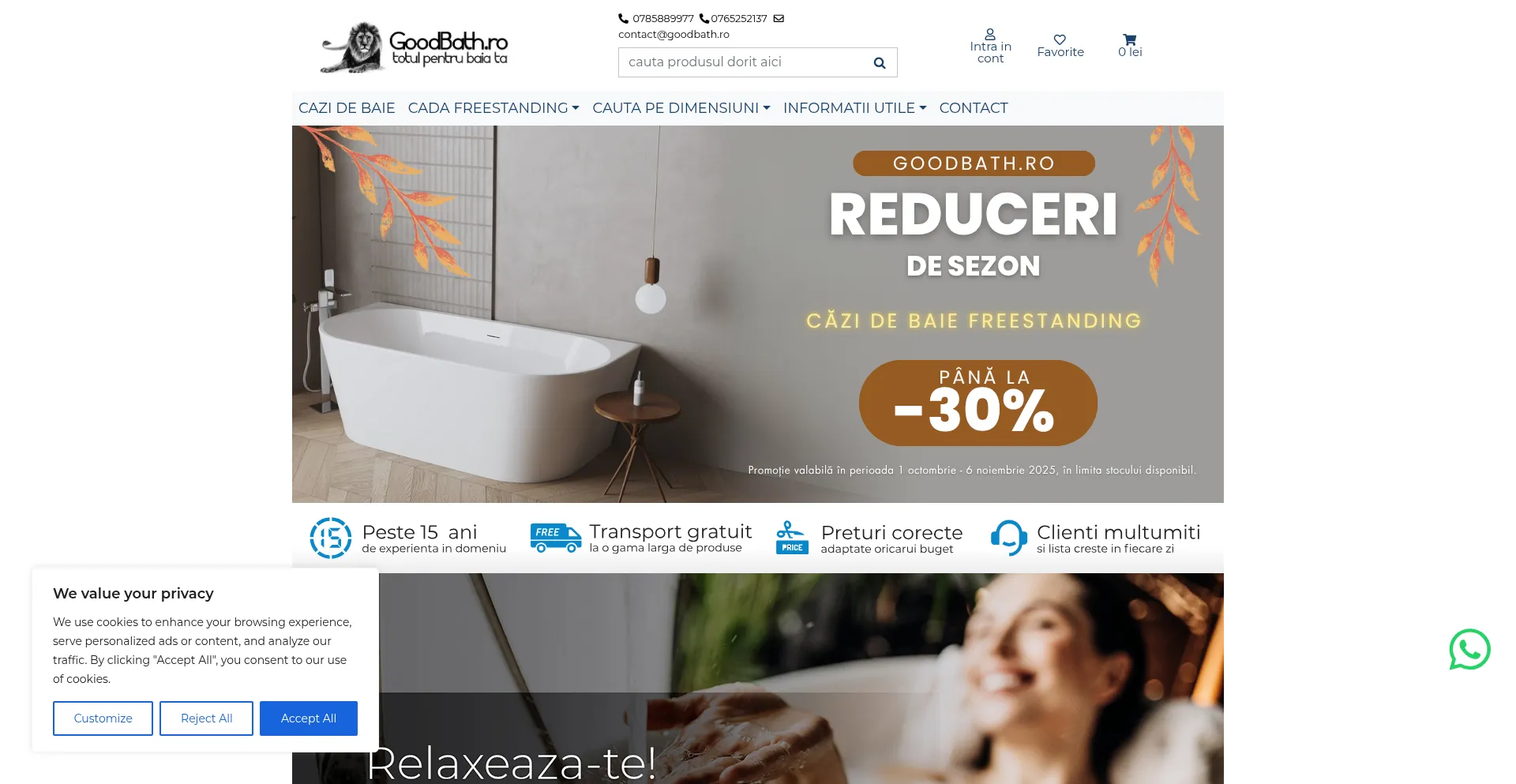 Die Website implementiert Cookie-Zustimmungsmechanismen in Compliance mit Datenschutzregulierungen wie DSGVO oder CCPA. Dies demonstriert, dass goodbath.ro Datenschutzstandards einhält und Benutzern Kontrolle über persönliche Datenerfassungspraktiken bietet.