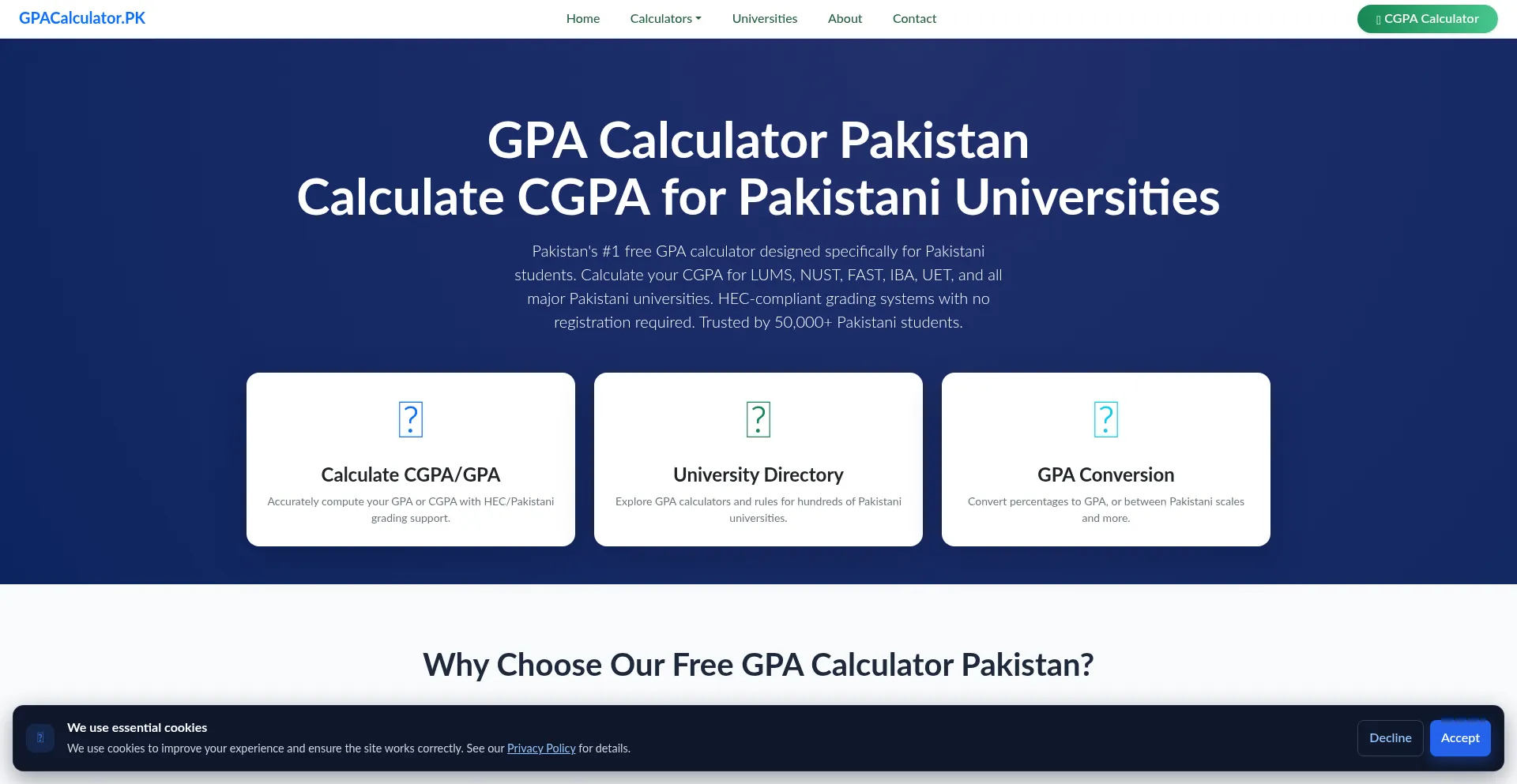 Die Website implementiert Cookie-Zustimmungsmechanismen in Compliance mit Datenschutzregulierungen wie DSGVO oder CCPA. Dies demonstriert, dass gpacalculator.pk Datenschutzstandards einhält und Benutzern Kontrolle über persönliche Datenerfassungspraktiken bietet.