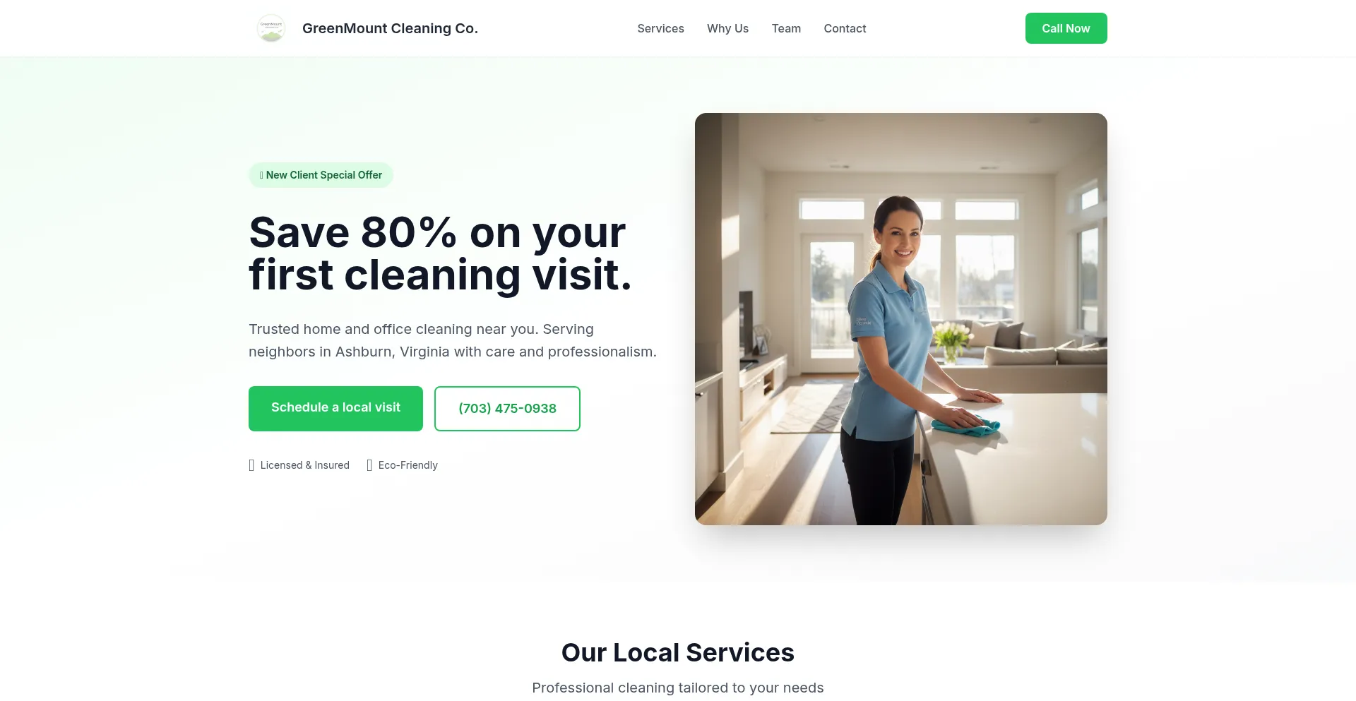 Trusted home and office cleaning in Ashburn, VA. Licensed, insured, eco-friendly. Save 80% on your first cleaning visit.