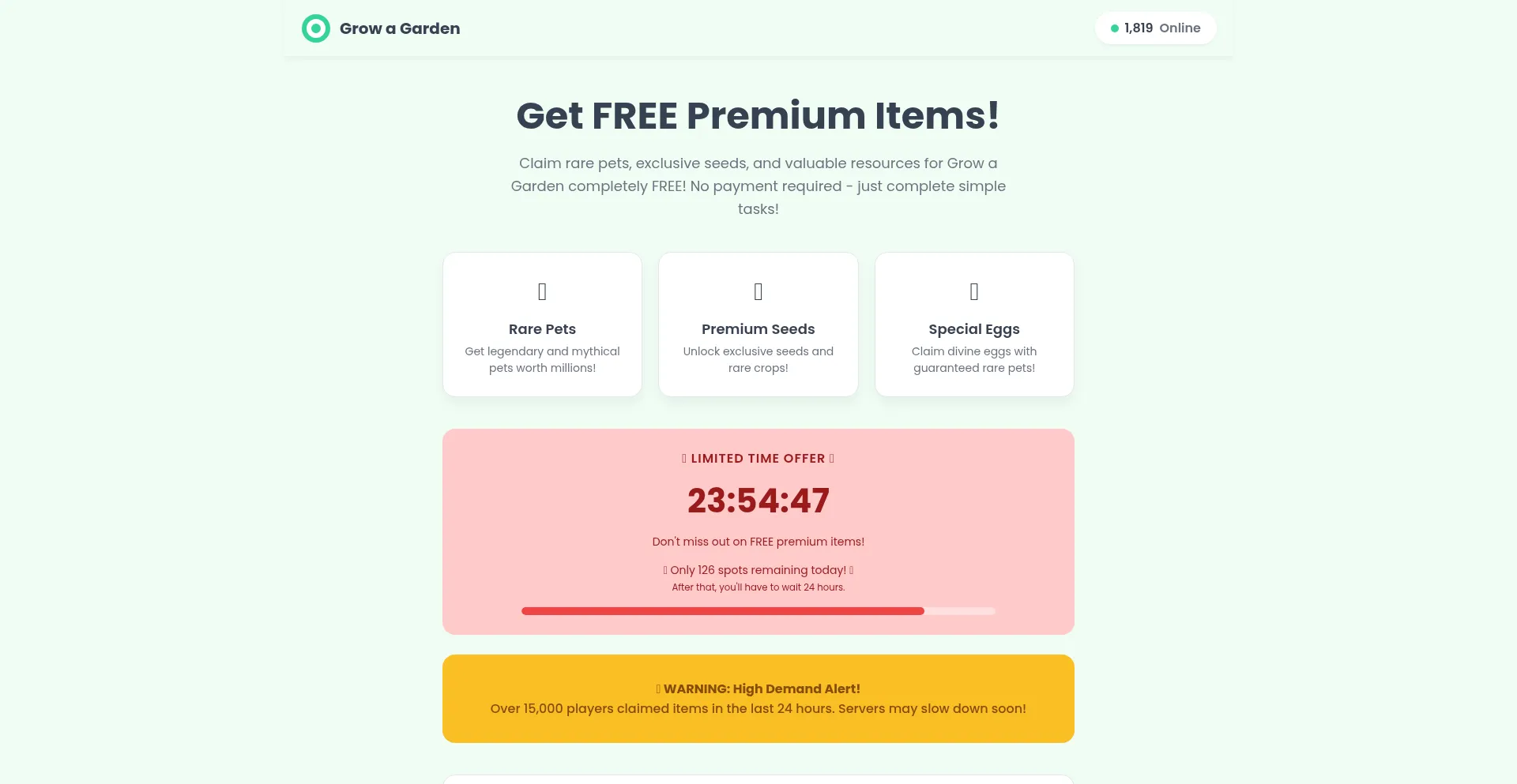 Sicherheitswarnung: growbotgarden.com bietet kostenloses Robux an, was einen häufigen Social-Engineering-Angriffsvektor darstellt, der darauf ausgelegt ist, Benutzerkonten zu kompromittieren und persönliche Informationen zu stehlen. Solche Angebote stellen typischerweise betrügerische Schemata dar, die Gaming-Plattform-Benutzer ins Visier nehmen.