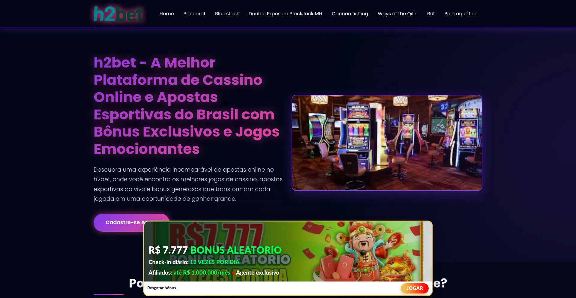h2bet é a plataforma líder de cassino online e apostas esportivas no Brasil. Jogue Baccarat, BlackJack, caça-níqueis e aposte em esportes com bônus generosos.