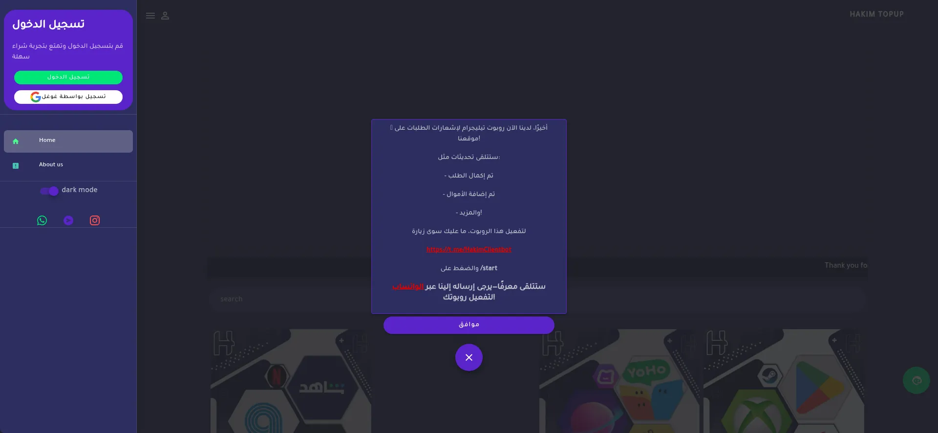 متجر Hakim Top Up لشحن الالعاب والتطبيقات وبرامج الشات والخدمات الرقمية