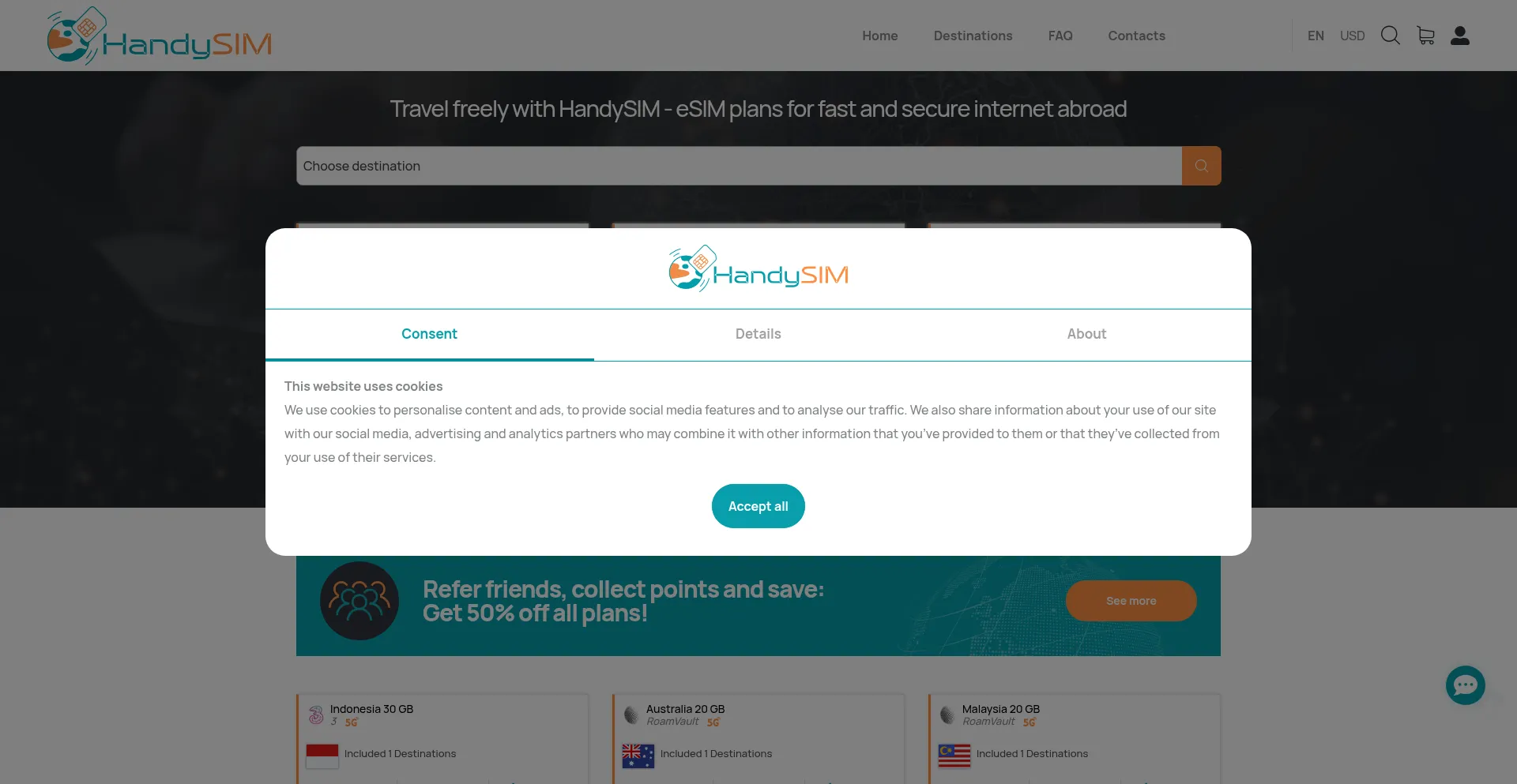 Die Website implementiert Cookie-Zustimmungsmechanismen in Compliance mit Datenschutzregulierungen wie DSGVO oder CCPA. Dies demonstriert, dass handysim.com Datenschutzstandards einhält und Benutzern Kontrolle über persönliche Datenerfassungspraktiken bietet.