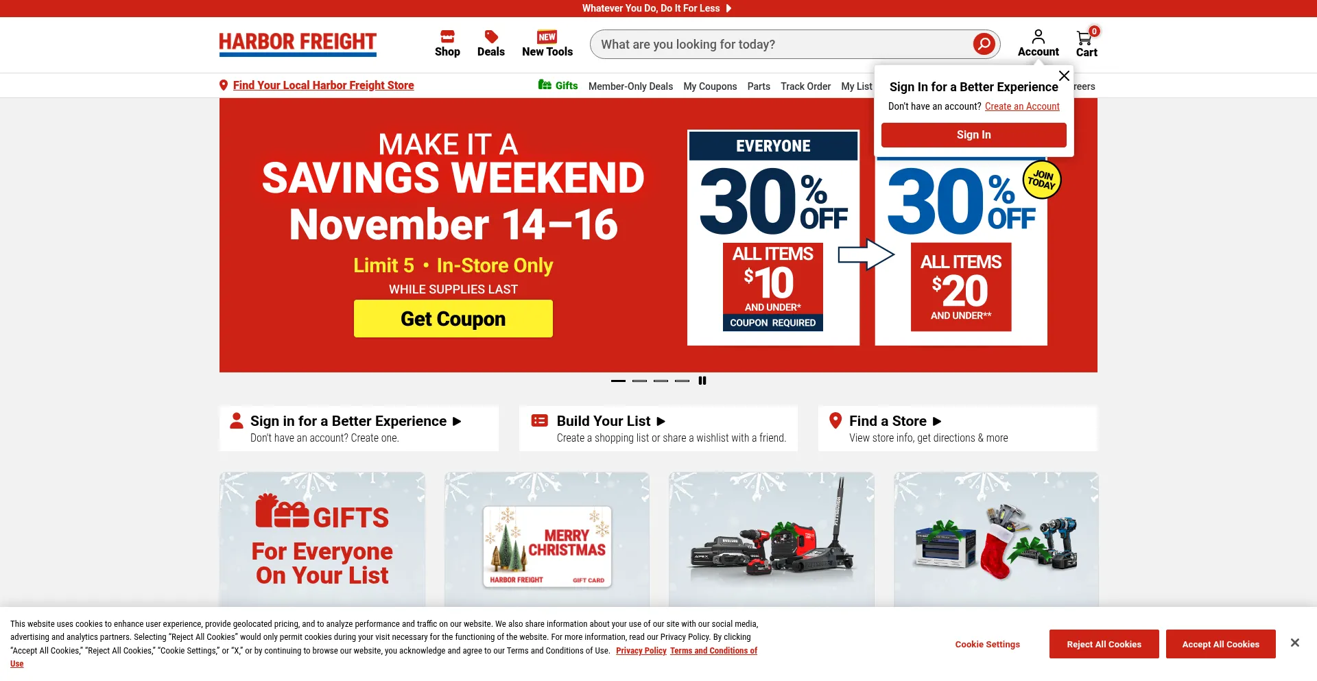 Die Website implementiert Cookie-Zustimmungsmechanismen in Compliance mit Datenschutzregulierungen wie DSGVO oder CCPA. Dies demonstriert, dass harborfreight.com Datenschutzstandards einhält und Benutzern Kontrolle über persönliche Datenerfassungspraktiken bietet.