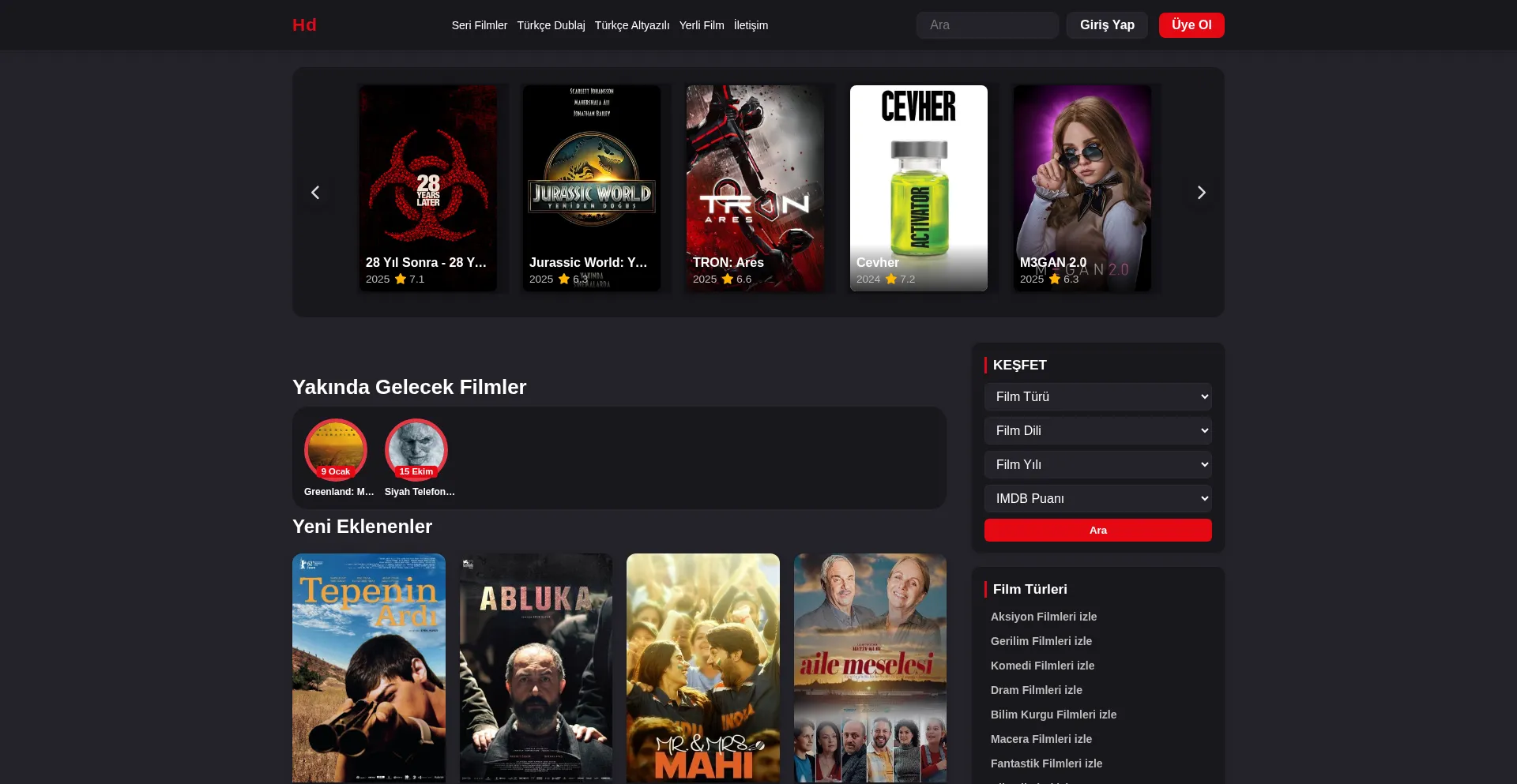 Yeni çıkan filmleri ve klasik yapımları HD kalitede izleyin. Türkçe dublaj ve altyazılı seçeneklerle sinema keyfini evinize getiren güvenilir film platformu.