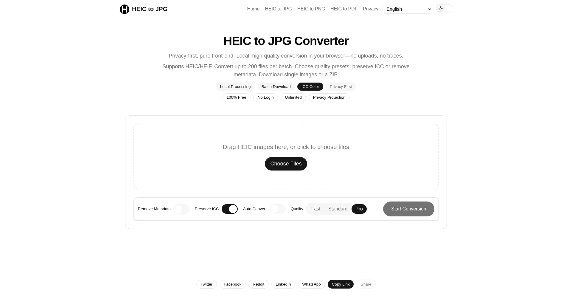 HEIC to JPG converter — 100% free and unlimited. No login required. Local, high-quality conversion in your browser with privacy protection.