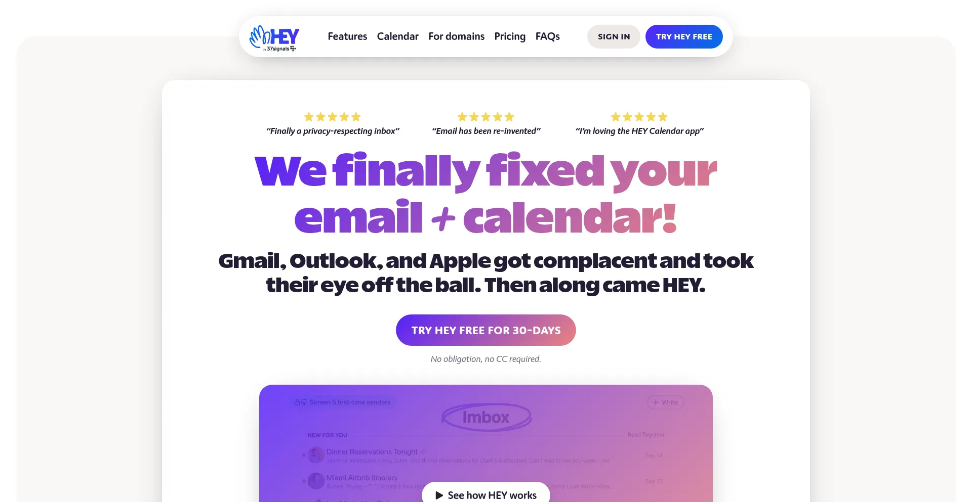 HEY — A delightfully fresh take on email + calendar, from 37signals