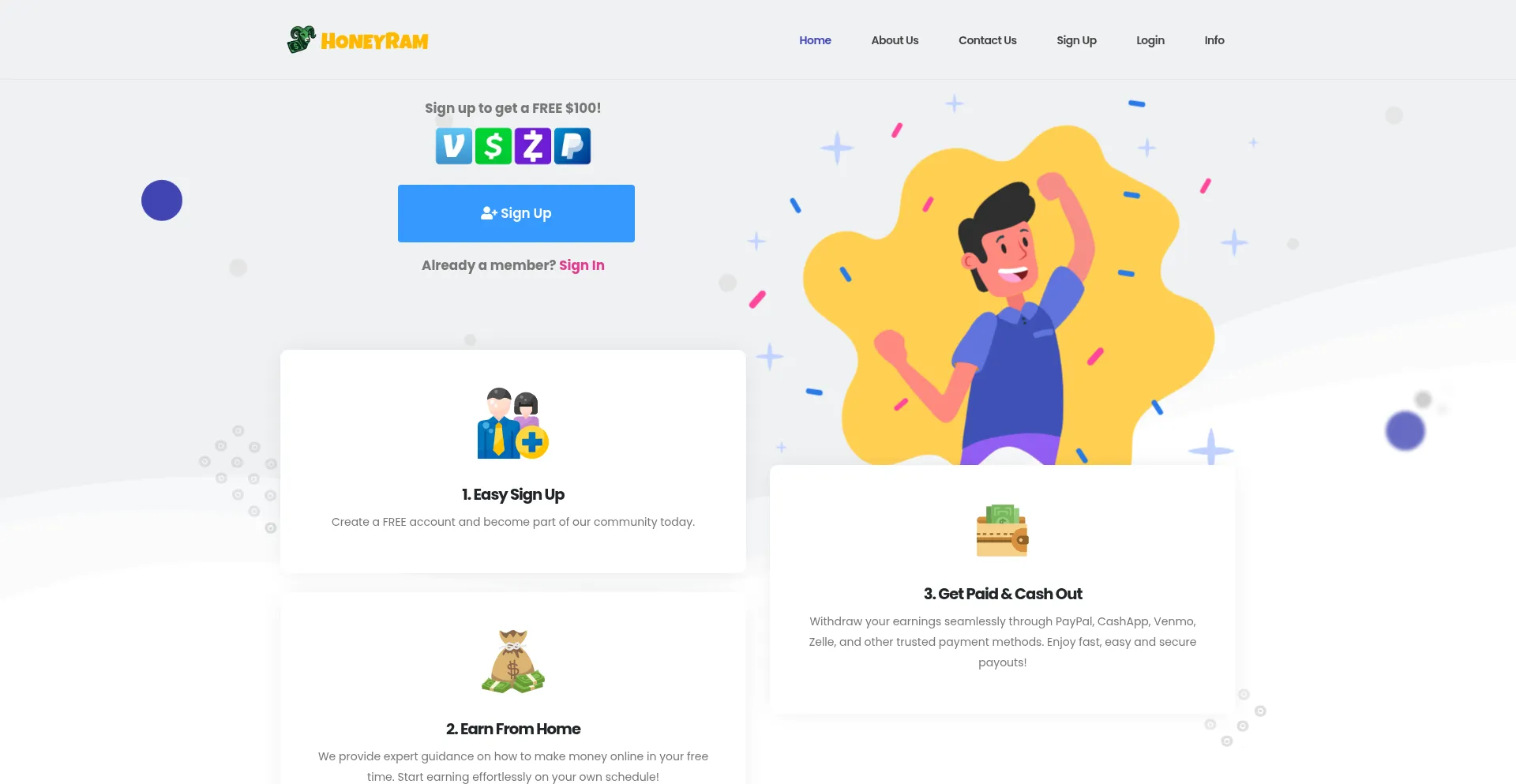 Honeyram.com ist eine Betrugsseite, die fälschlicherweise behauptet, dass Nutzer "Geld durch Facebook, Instagram, SnapChat, Twitter verdienen" können, indem sie Empfehlungslinks teilen. In Wirklichkeit ist sie darauf ausgelegt, Geld durch betrügerische Versprechungen zu stehlen.