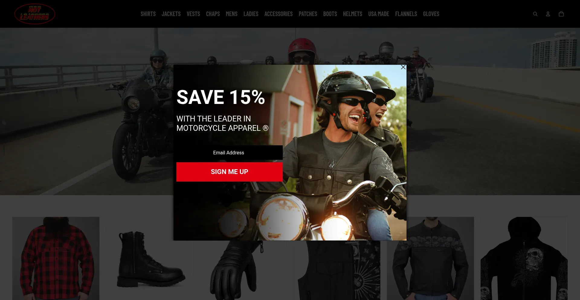 Hot Leathers The Leader in Motorcycle Apparel Biker shirts, motorcycle patches, USA Made leather jackets, chaps, vests, Helmets, Saddlebags, biker gifts and more! Official Sturg...