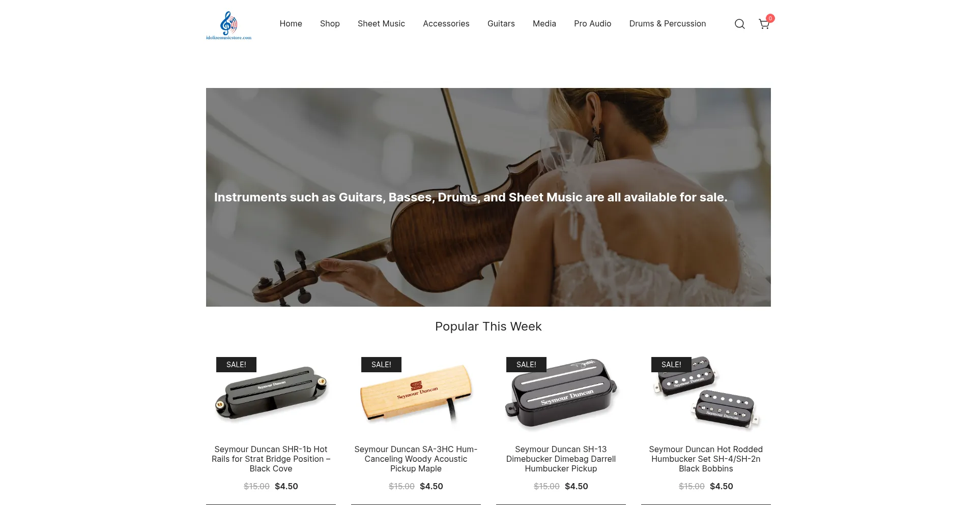 Instruments such as Guitars, Basses, Drums, and Sheet Music are all available for sale.-idolizemusicstore.com