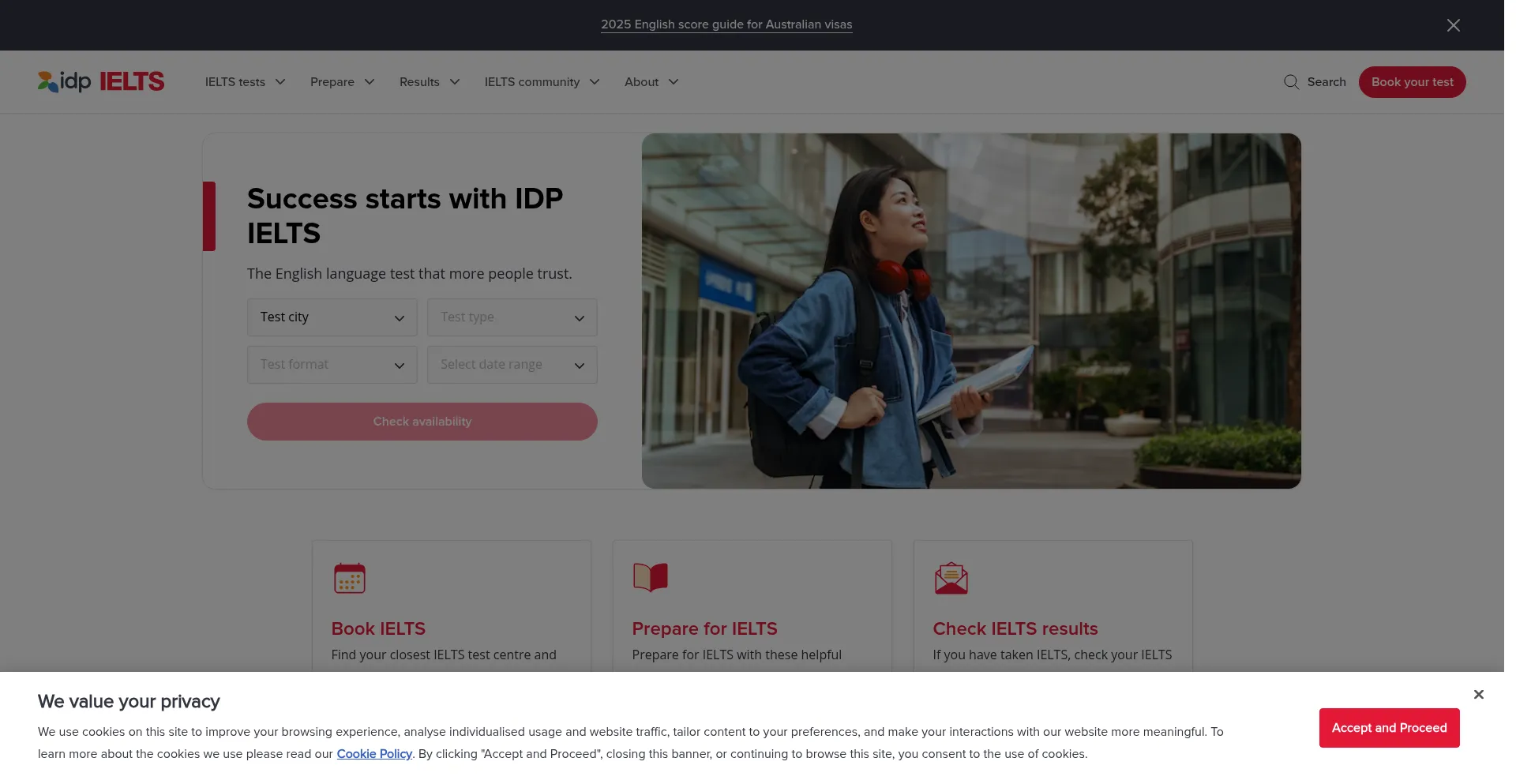 Die Website implementiert Cookie-Zustimmungsmechanismen in Compliance mit Datenschutzregulierungen wie DSGVO oder CCPA. Dies demonstriert, dass ielts.com.au Datenschutzstandards einhält und Benutzern Kontrolle über persönliche Datenerfassungspraktiken bietet.