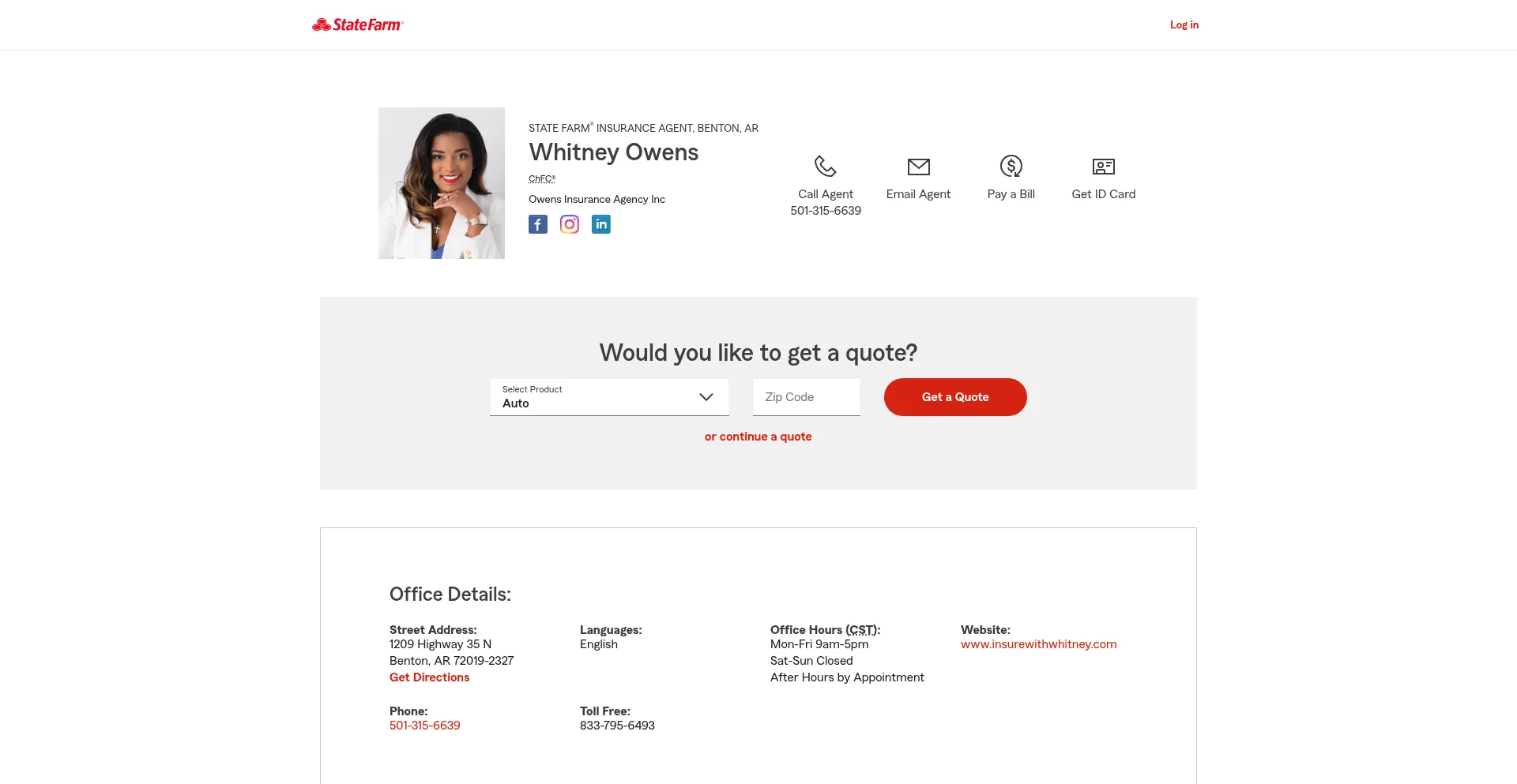 Contact Benton State Farm Agent Whitney Owens at (501) 315-6639 for life, home, car insurance and more. Get a free quote now