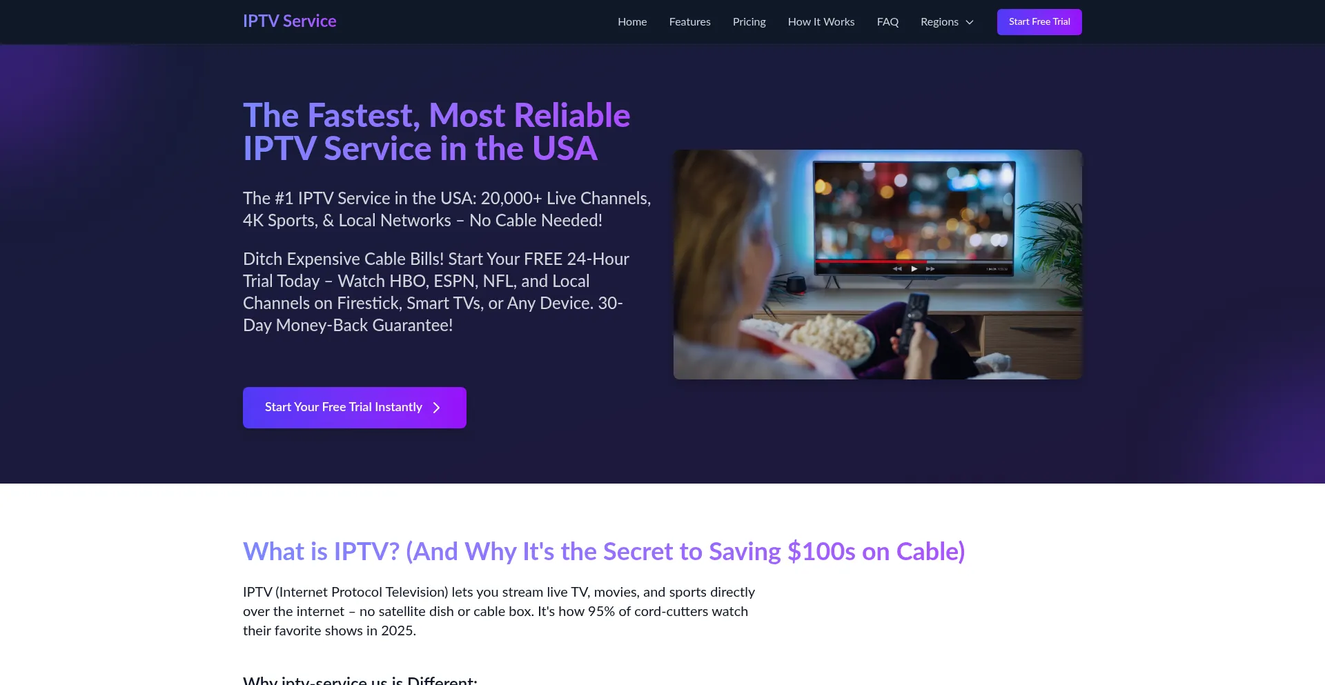 Watch local USA channels, sports, and 4K movies with the #1 legal IPTV service. Free 24-hour trial + 30-day guarantee. Start streaming now!