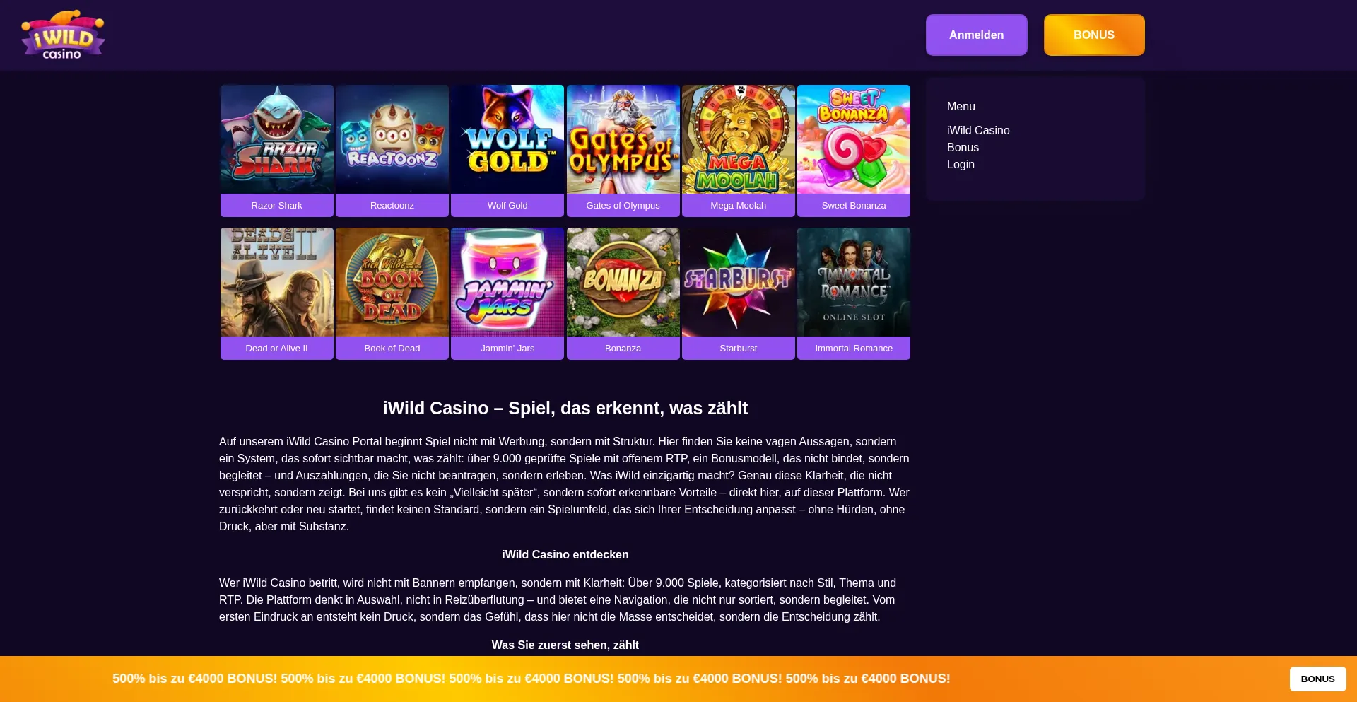 Über 9.000 zertifizierte Spiele, offene RTP-Werte und sofort startbereite Demos – iWild bietet nicht nur Spiel, sondern Struktur, die Entscheidungen stärkt.