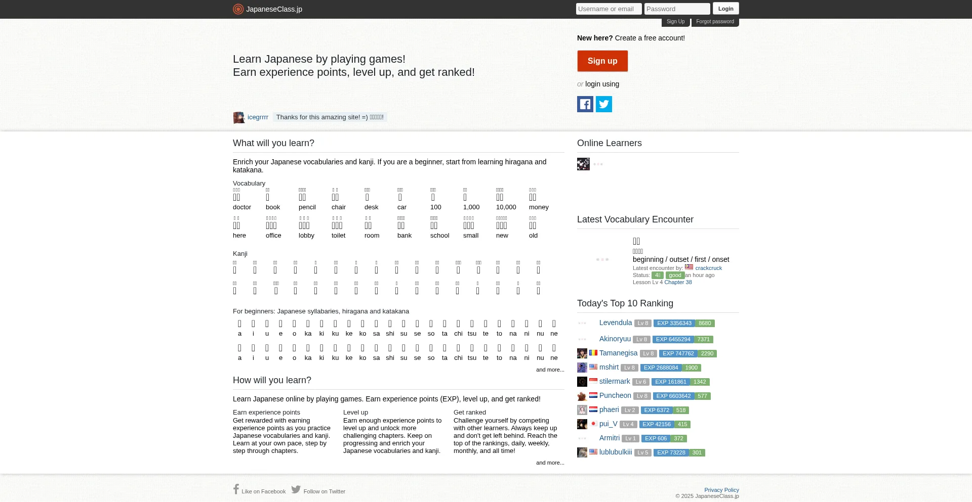 JapaneseClass.jp is a site to learn Japanese online by playing games, focus on enriching vocabularies and kanji in a fun and social way.