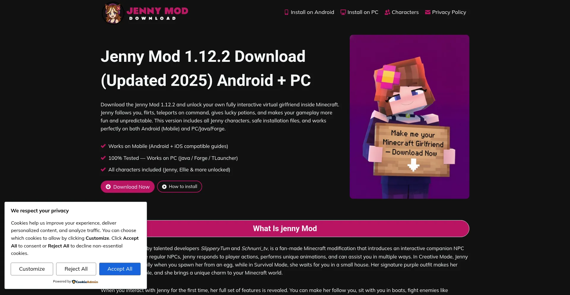 Download the latest Jenny Mod 1.12.2 for Minecraft on Android (Pojav Launcher) and PC (Forge/TLauncher). Unlock interactive companions, flirty animations