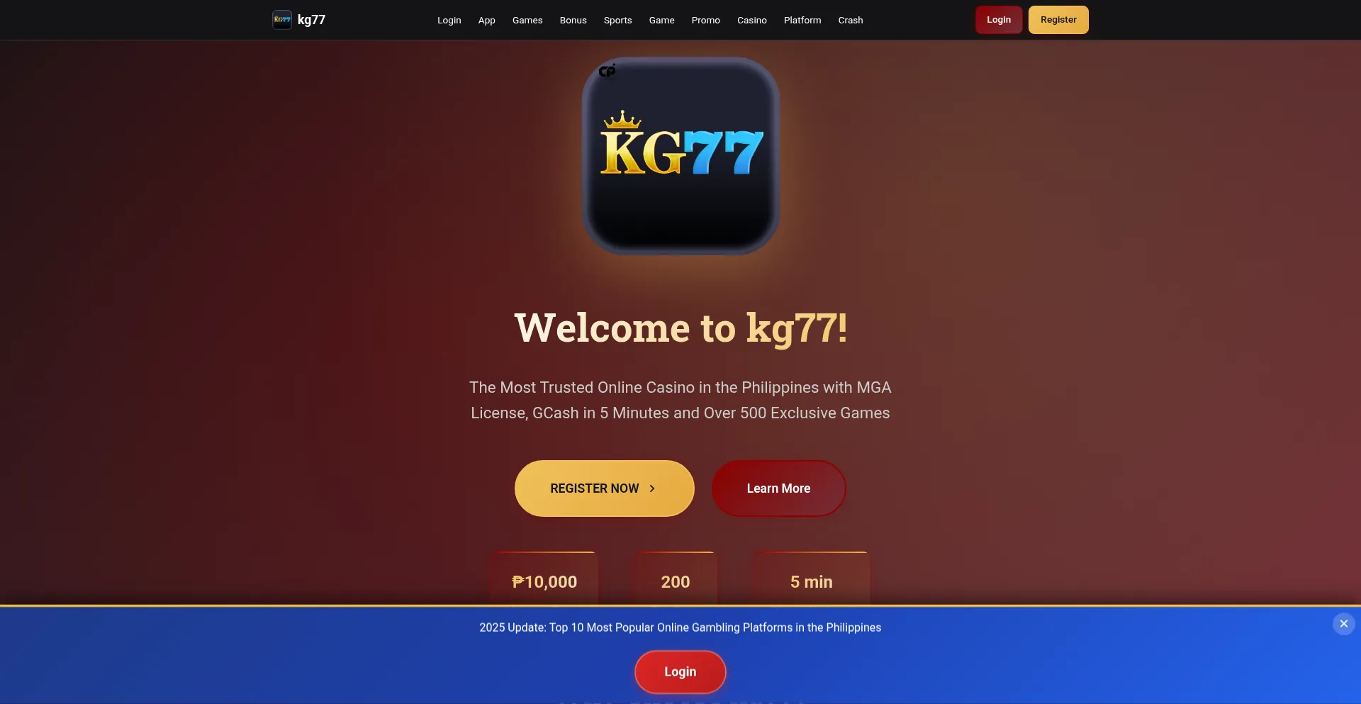 Play at kg77, the most trusted online casino in the Philippines! MGA License, GCash in 5min, 500+ exclusive games. Register and get ₱10,000 + 200 free spins!