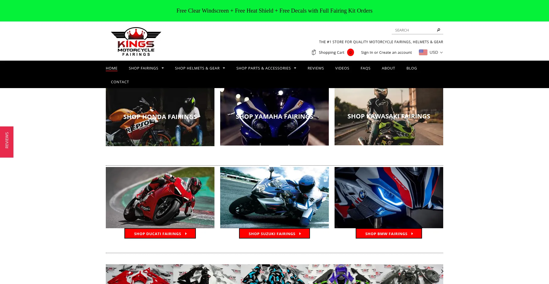 Shop thousands of the best quality motorcycle fairings for Honda, Yamaha, Ducati, Kawasaki, Aprilia, Triumph, Suzuki and Helmets at Kings Motorcycle Fairings!