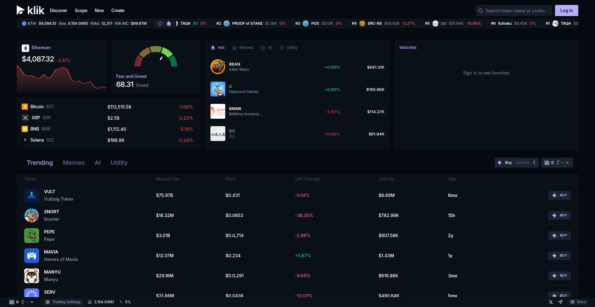 Explore Ethereum's hottest tokens on KLIK. Trade memes, AI, utilities & more with multiwallets, lowest fees & pro tools