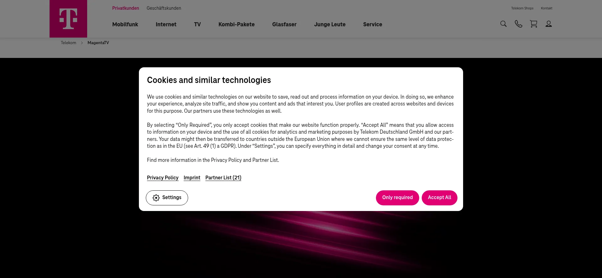 Die Website implementiert Cookie-Zustimmungsmechanismen in Compliance mit Datenschutzregulierungen wie DSGVO oder CCPA. Dies demonstriert, dass magentatv.de Datenschutzstandards einhält und Benutzern Kontrolle über persönliche Datenerfassungspraktiken bietet.