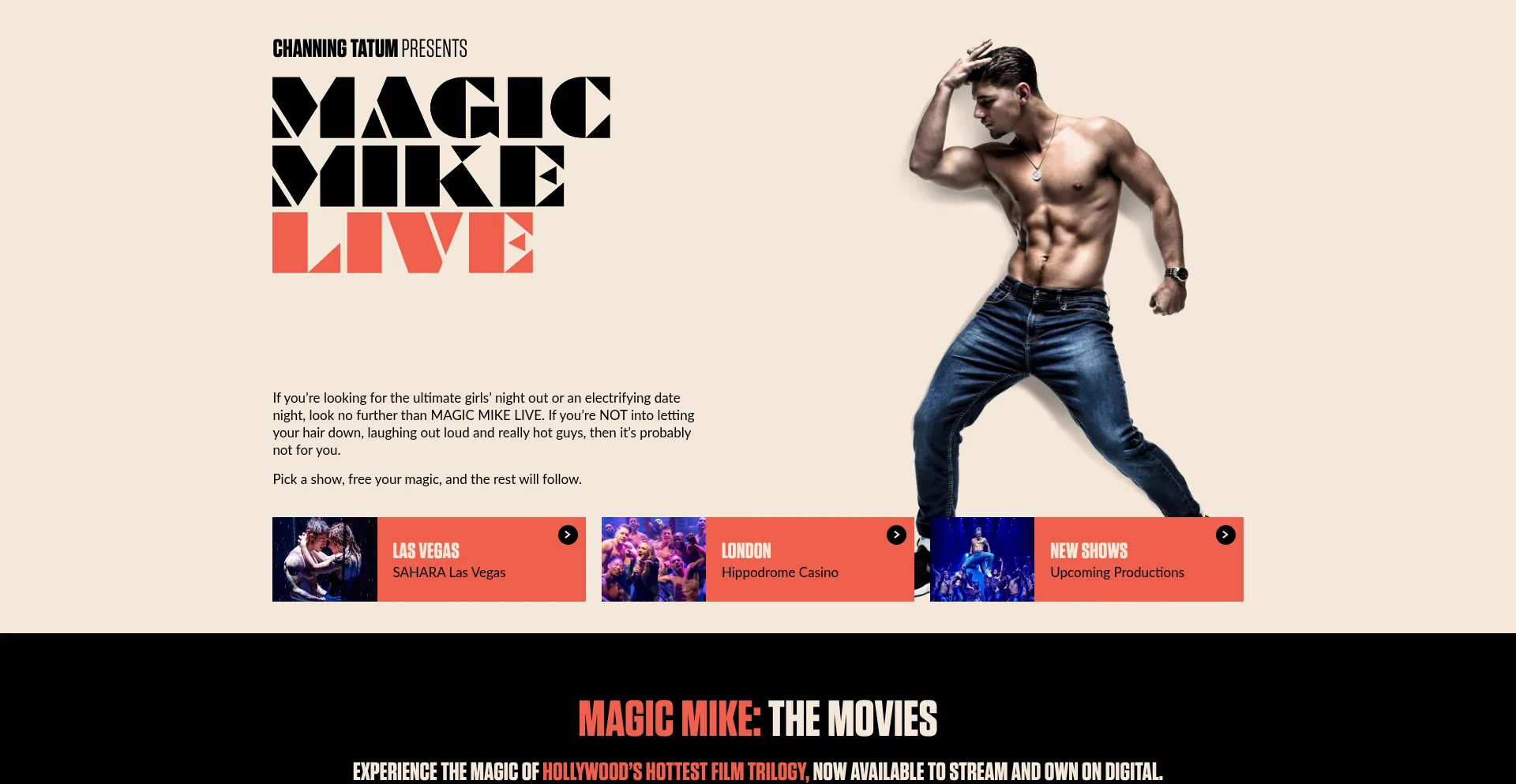 Based on the hit films, get tickets to experience Channing Tatum’s irresistibly entertaining MAGIC MIKE LIVE on stage in Las Vegas and London.