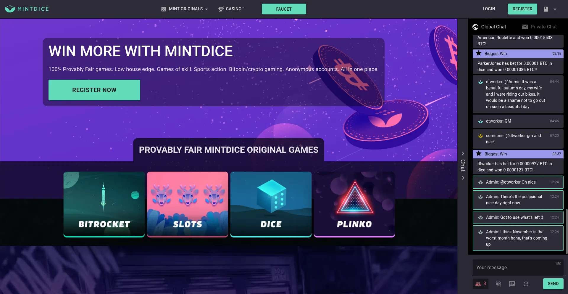 100% Provably Fair Bitcoin and cryptocurrency casino games and games of skill. Play Bitcoin dice, slots, plinko and BitRocket - a unique Bitcoin crash game of skill found only o...