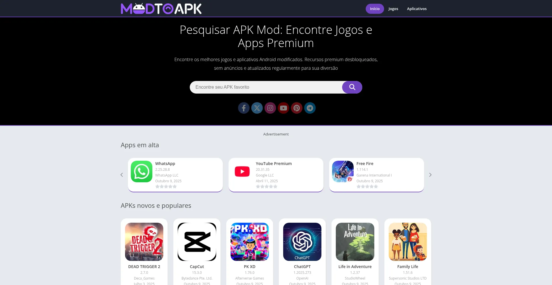 Die Anwesenheit von Social-Media-Links auf der Website deutet darauf hin, dass modtoapk.com offizielle Konten auf Social-Media-Plattformen beibehält, was ein positiver Indikator für Glaubwürdigkeit und Engagement ist.