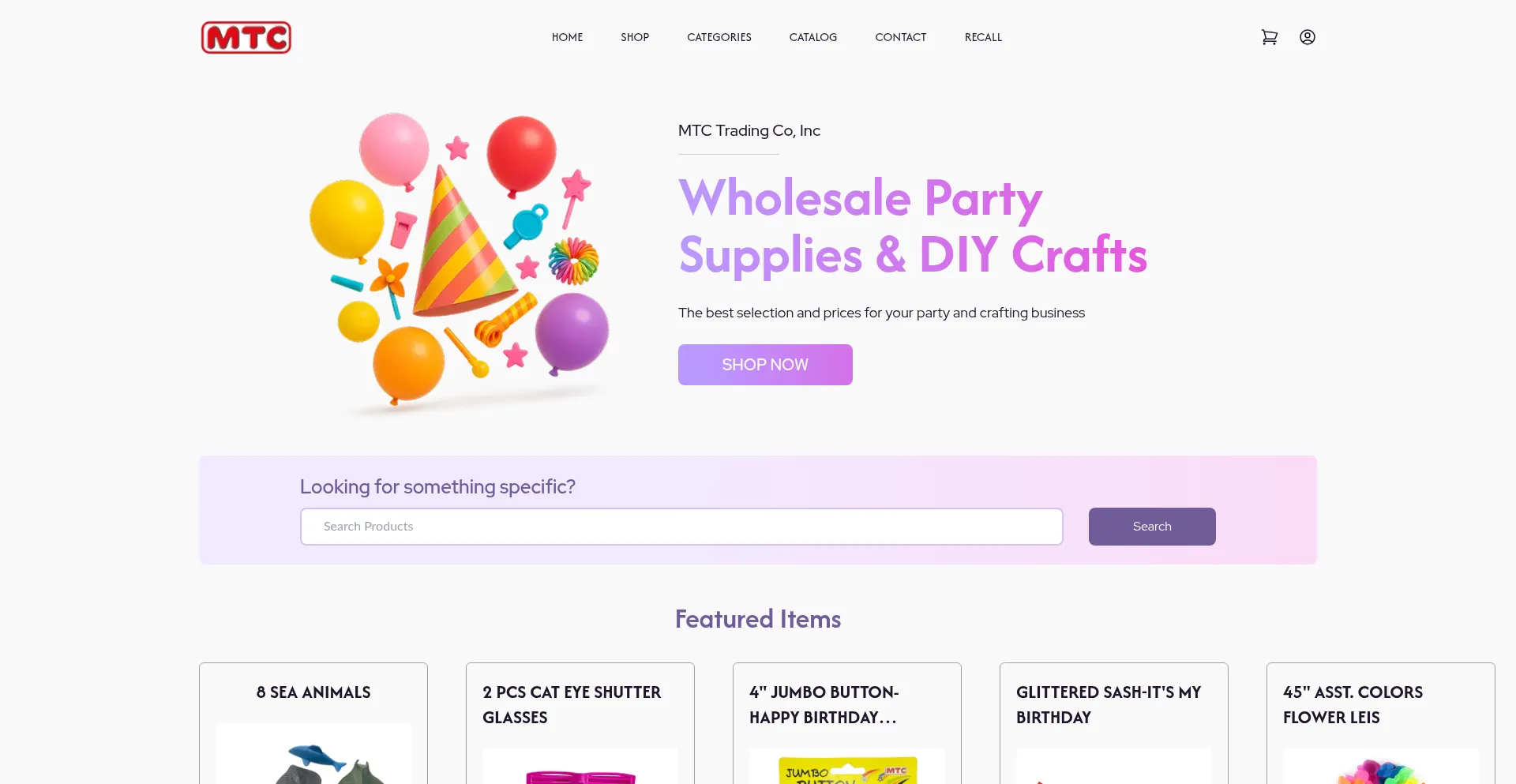 Buy wholesale party supplies in bulk from MTC Trading Co. Trusted by retailers for over 40 years. Nationwide B2B shipping. $500 minimum order.