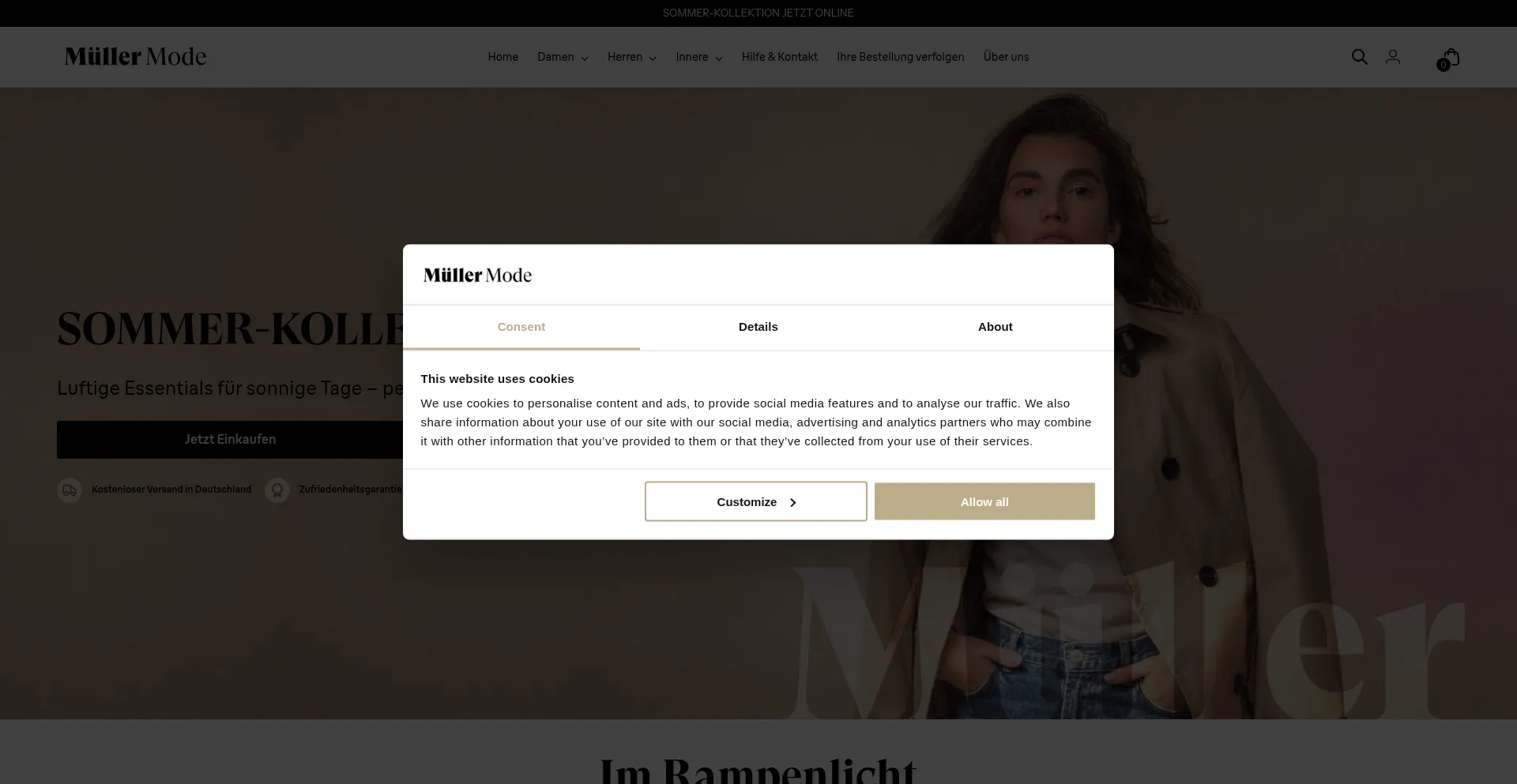 Die Website implementiert Cookie-Zustimmungsmechanismen in Compliance mit Datenschutzregulierungen wie DSGVO oder CCPA. Dies demonstriert, dass mullermode.de Datenschutzstandards einhält und Benutzern Kontrolle über persönliche Datenerfassungspraktiken bietet.