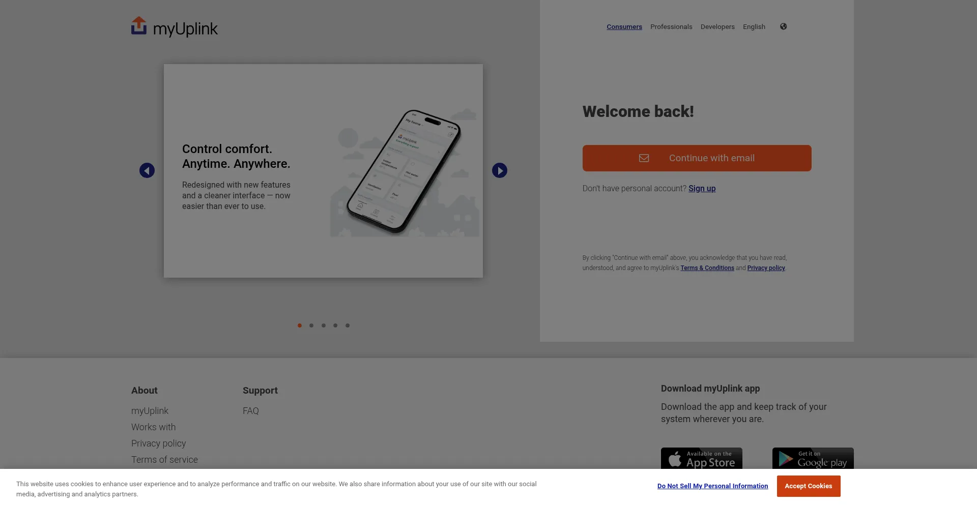 Die Website implementiert Cookie-Zustimmungsmechanismen in Compliance mit Datenschutzregulierungen wie DSGVO oder CCPA. Dies demonstriert, dass myuplink.com Datenschutzstandards einhält und Benutzern Kontrolle über persönliche Datenerfassungspraktiken bietet.