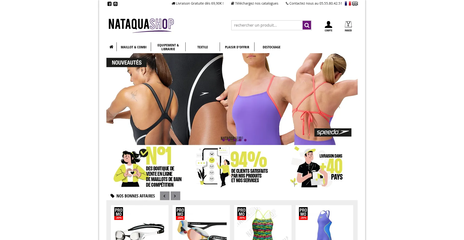 Nataquashop, vente d’equipement de natation : combinaison, maillot de bain, lunette de natation.