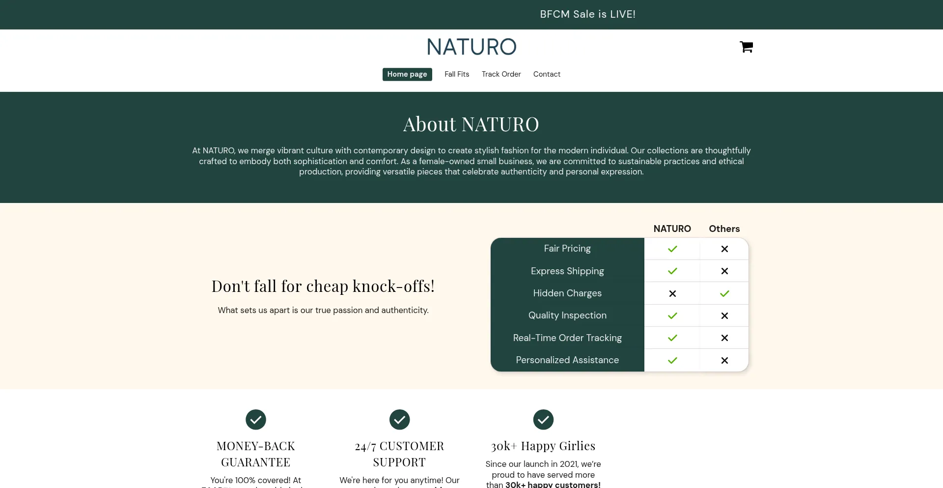 Shopping, Reliable Payment Method, Deals, Uses Free eCommerce Engine, Shopify Platform, Facebook Integration, Young Domain