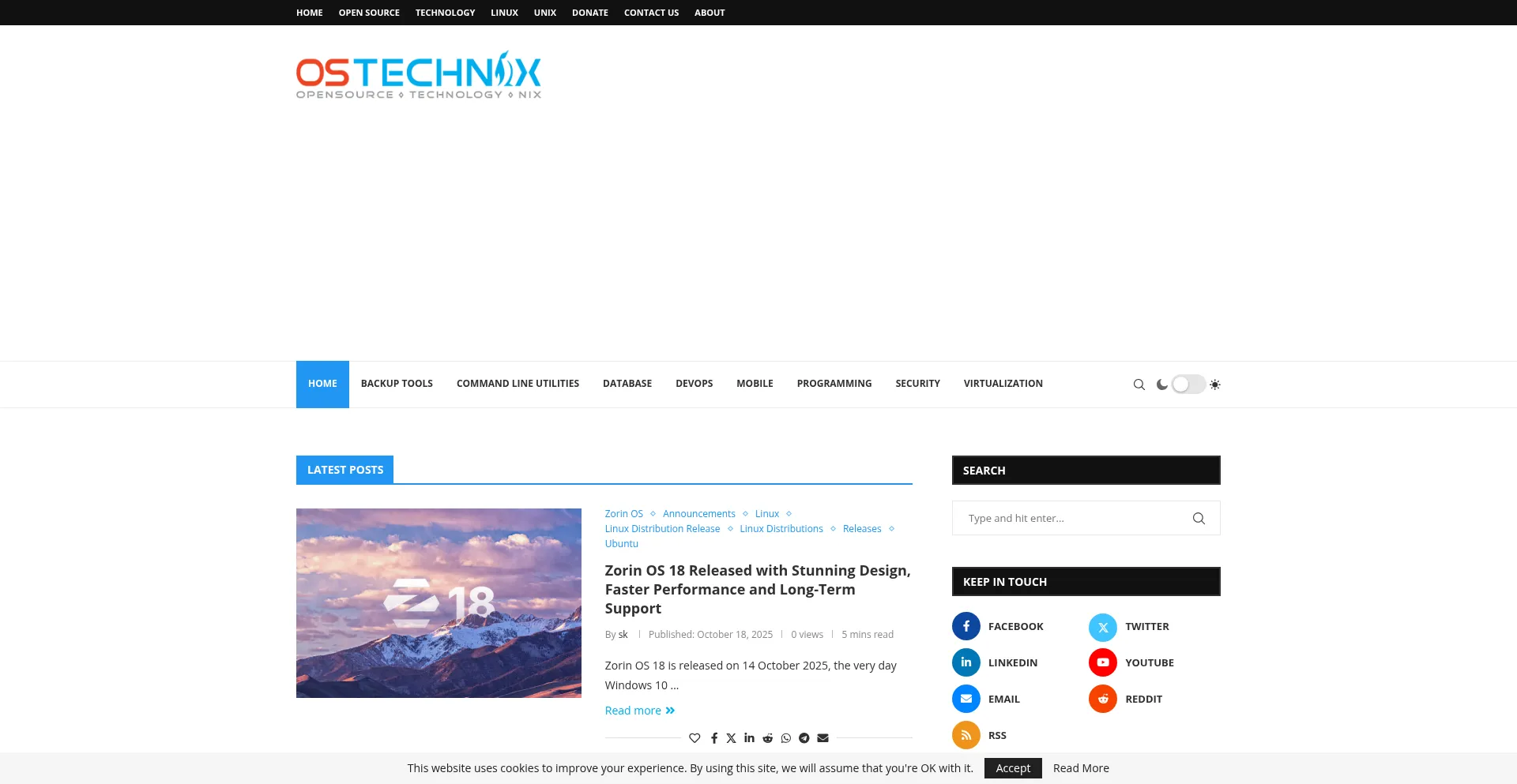 Die Anwesenheit von Social-Media-Links auf der Website deutet darauf hin, dass ostechnix.com offizielle Konten auf Social-Media-Plattformen beibehält, was ein positiver Indikator für Glaubwürdigkeit und Engagement ist.