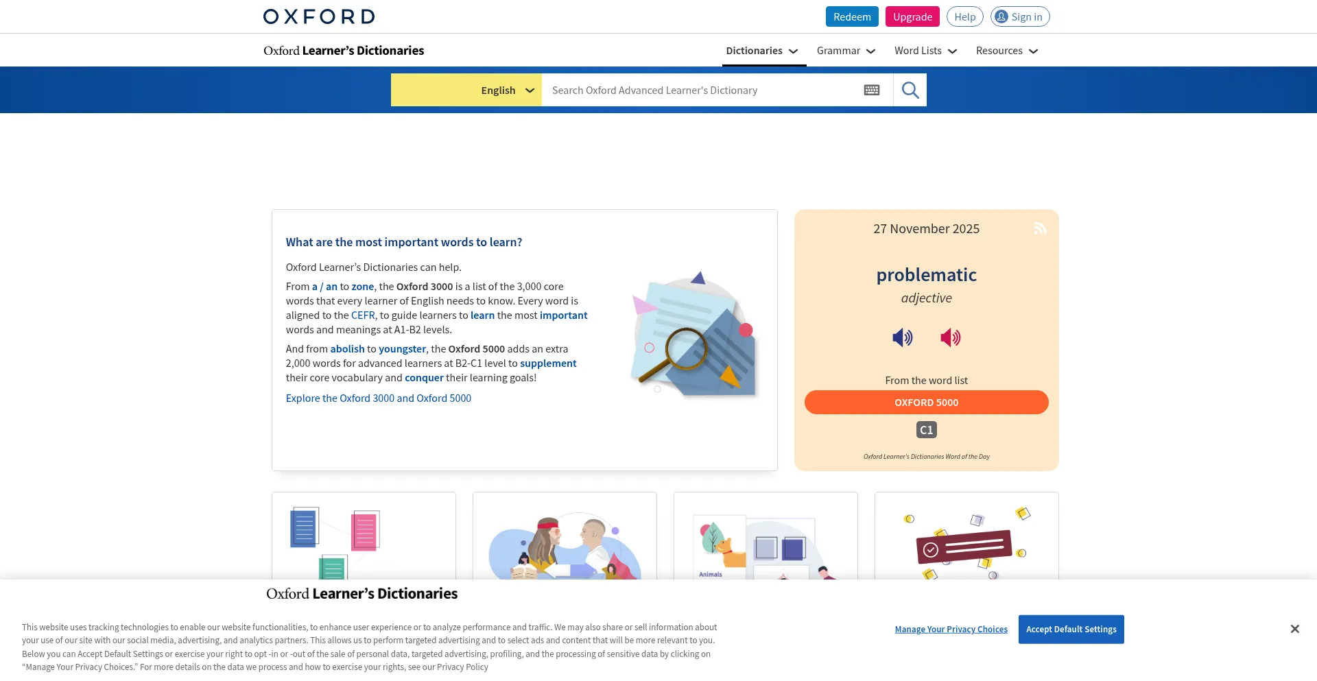 Die Website implementiert Cookie-Zustimmungsmechanismen in Compliance mit Datenschutzregulierungen wie DSGVO oder CCPA. Dies demonstriert, dass oxfordlearnersdictionaries.com Datenschutzstandards einhält und Benutzern Kontrolle über persönliche Datenerfassungspraktiken bietet.