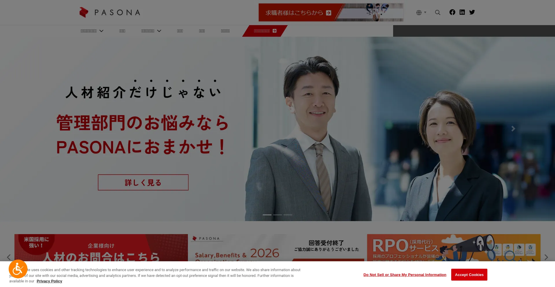 Die Anwesenheit von Social-Media-Links auf der Website deutet darauf hin, dass pasona.com offizielle Konten auf Social-Media-Plattformen beibehält, was ein positiver Indikator für Glaubwürdigkeit und Engagement ist.