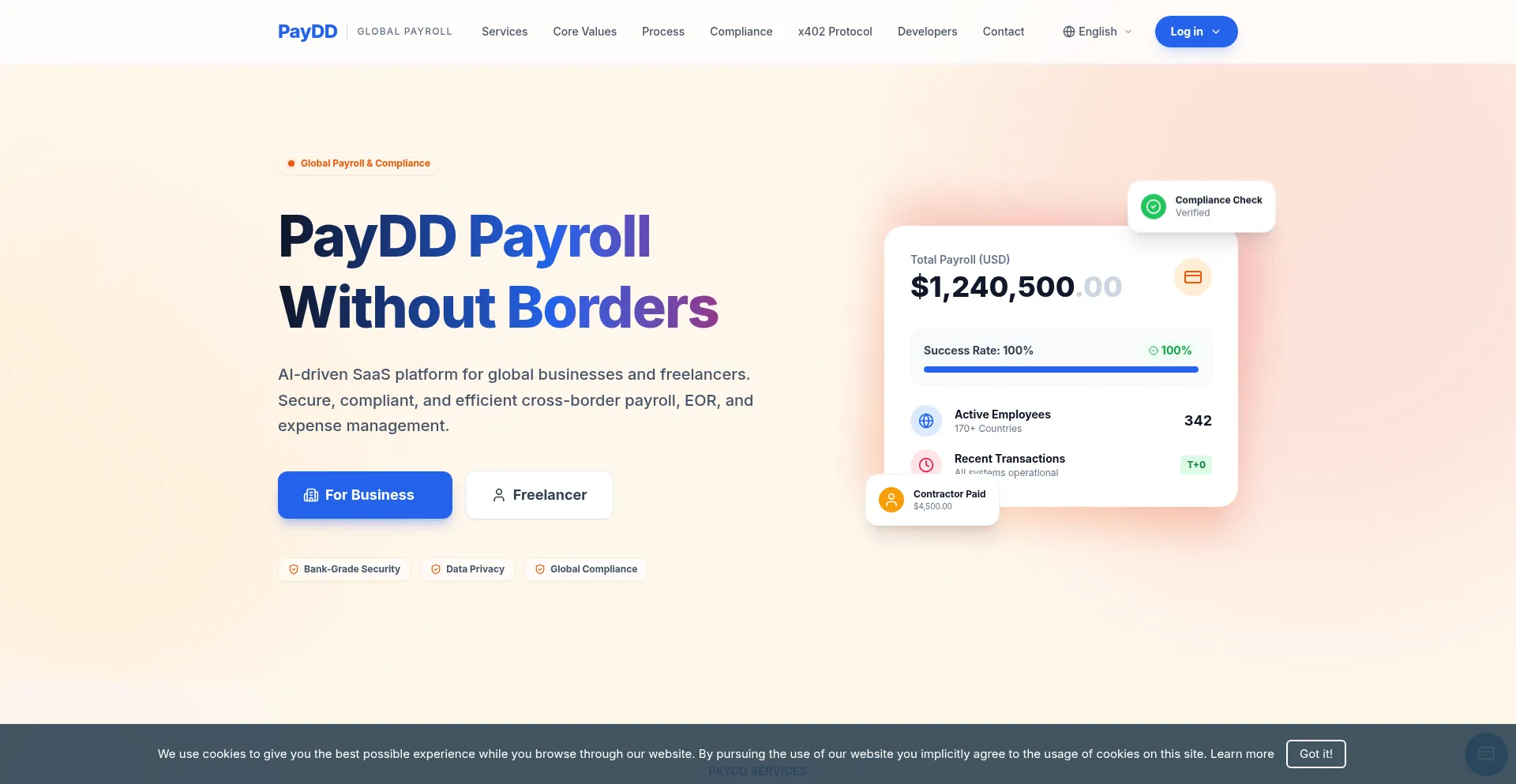 PayDD provides intelligent cross-border payroll, EOR solutions, and supports the x402 protocol for instant settlement. 薪酬无国界,合规高效,接入 x402 协议极速�...