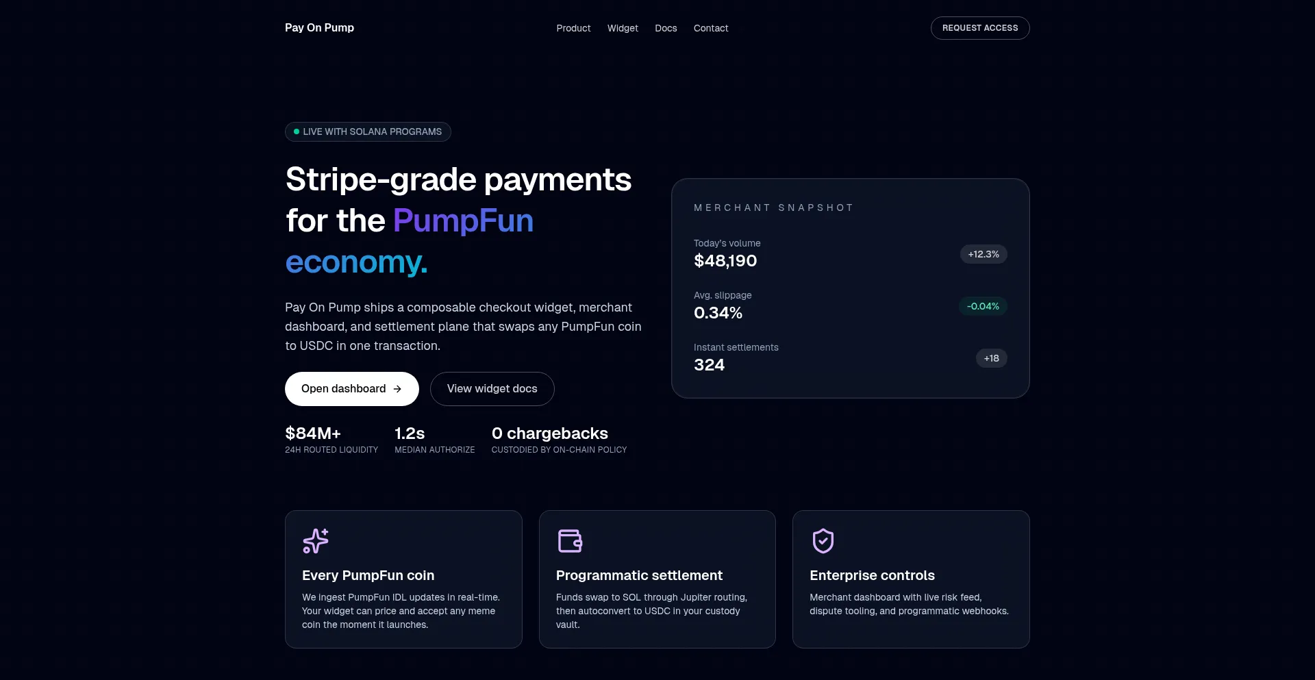 Drop-in widget, merchant dashboard, and settlement plane for every PumpFun coin on Solana.