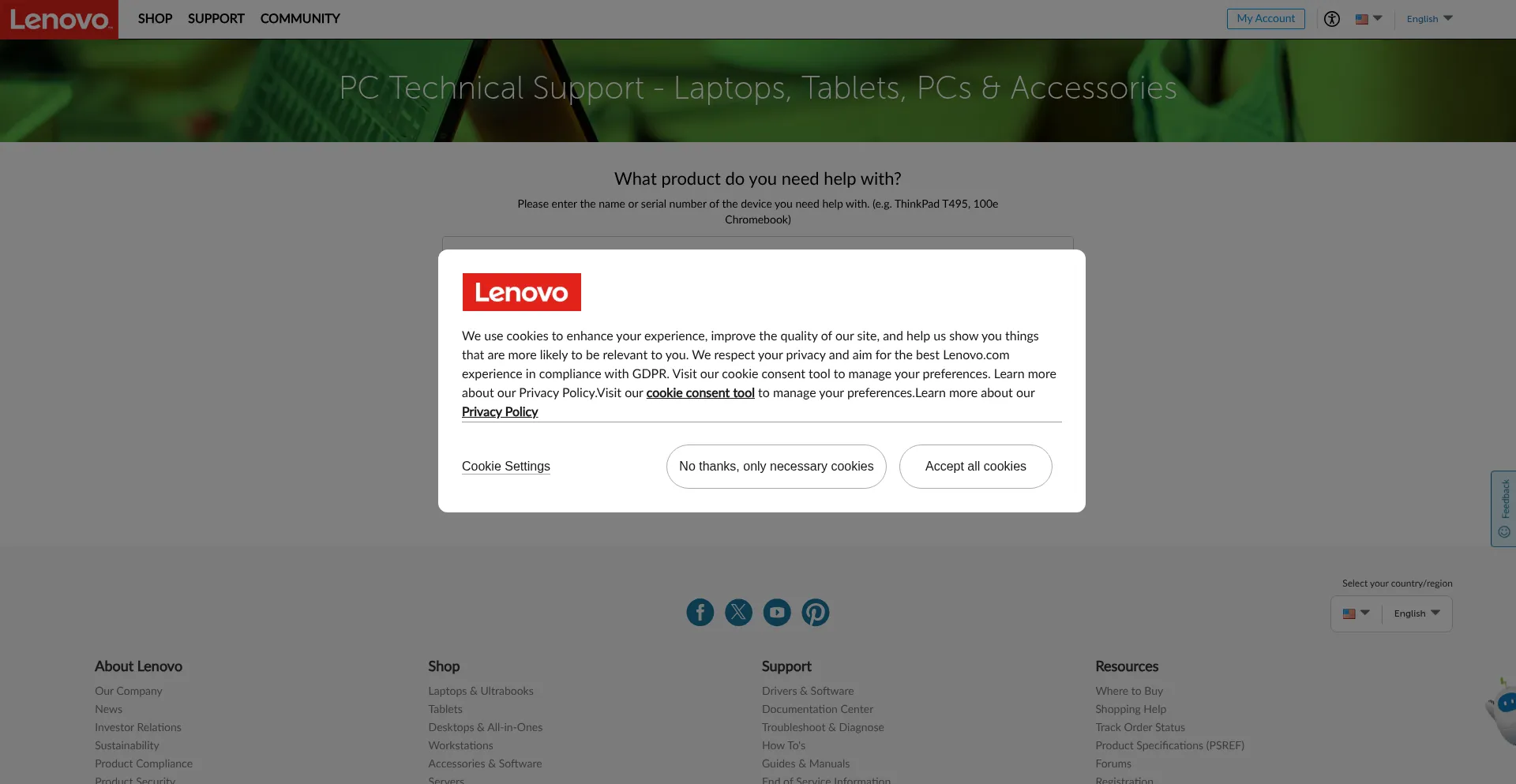 Die Website implementiert Cookie-Zustimmungsmechanismen in Compliance mit Datenschutzregulierungen wie DSGVO oder CCPA. Dies demonstriert, dass pcsupport.lenovo.com Datenschutzstandards einhält und Benutzern Kontrolle über persönliche Datenerfassungspraktiken bietet.
