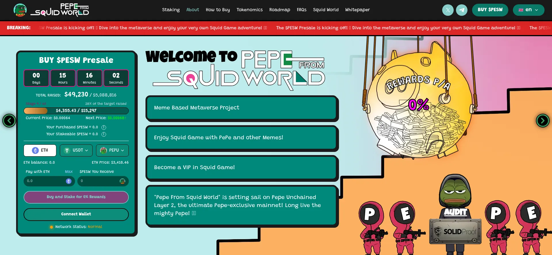 Welcome to the PEPE from Squid World! The PEPE meets a metaverse combined with "Squid Game" to offer a new experience. Feel 1000x the fun through games where the winner takes in...