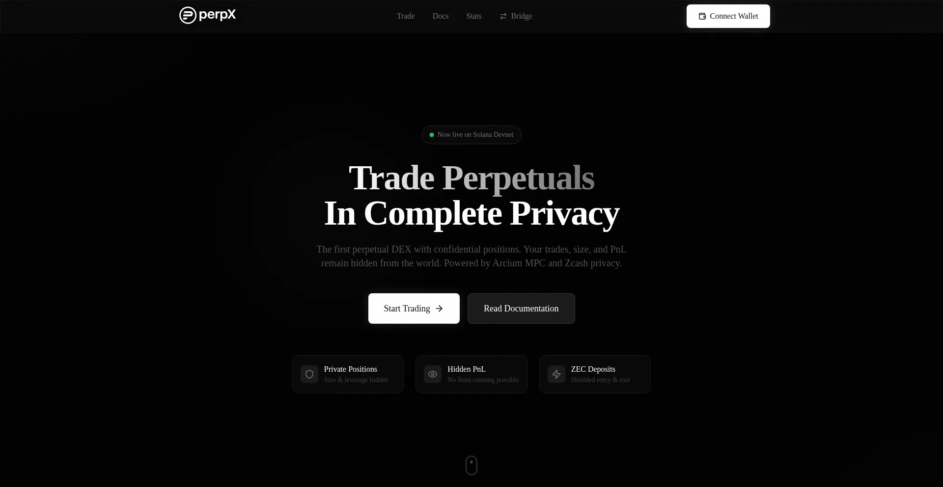 Trade perpetual futures with complete privacy. Powered by Arcium MPC and Zcash.