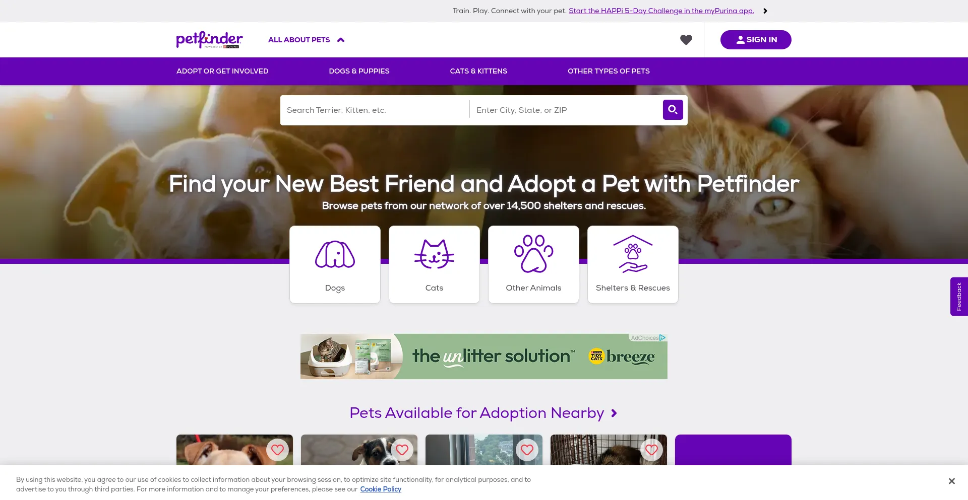 Die Website implementiert Cookie-Zustimmungsmechanismen in Compliance mit Datenschutzregulierungen wie DSGVO oder CCPA. Dies demonstriert, dass petfinder.com Datenschutzstandards einhält und Benutzern Kontrolle über persönliche Datenerfassungspraktiken bietet.