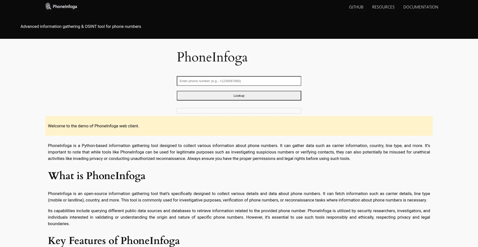 PhoneInfoga Gather phone number details like carrier, country, and geolocation for security or investigative purposes.