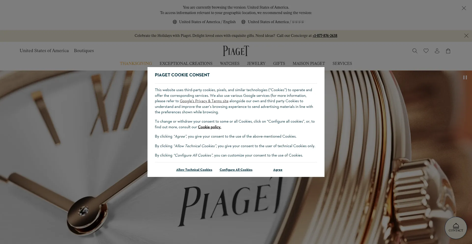 Die Website implementiert Cookie-Zustimmungsmechanismen in Compliance mit Datenschutzregulierungen wie DSGVO oder CCPA. Dies demonstriert, dass piaget.com Datenschutzstandards einhält und Benutzern Kontrolle über persönliche Datenerfassungspraktiken bietet.