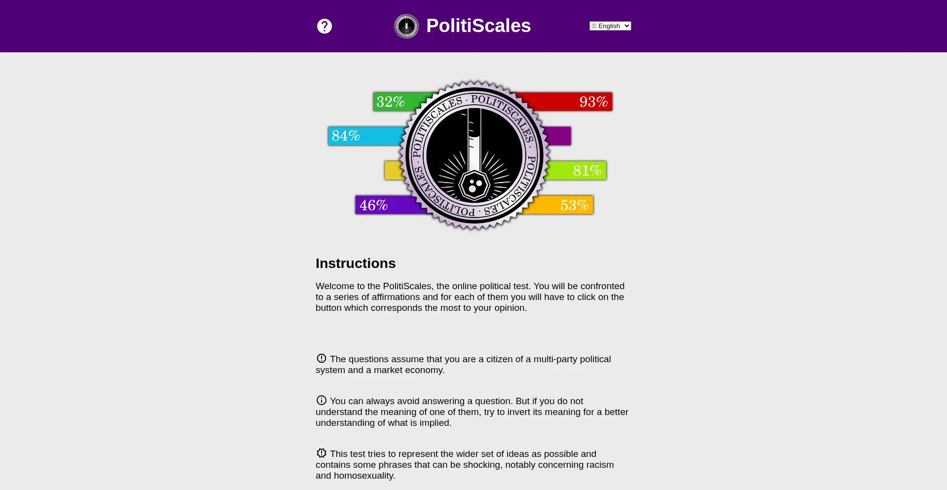 Welcome to the PolitiScales, the online political test. You will be confronted to a series of affirmations and for each of them you will have to click on the button which corres...